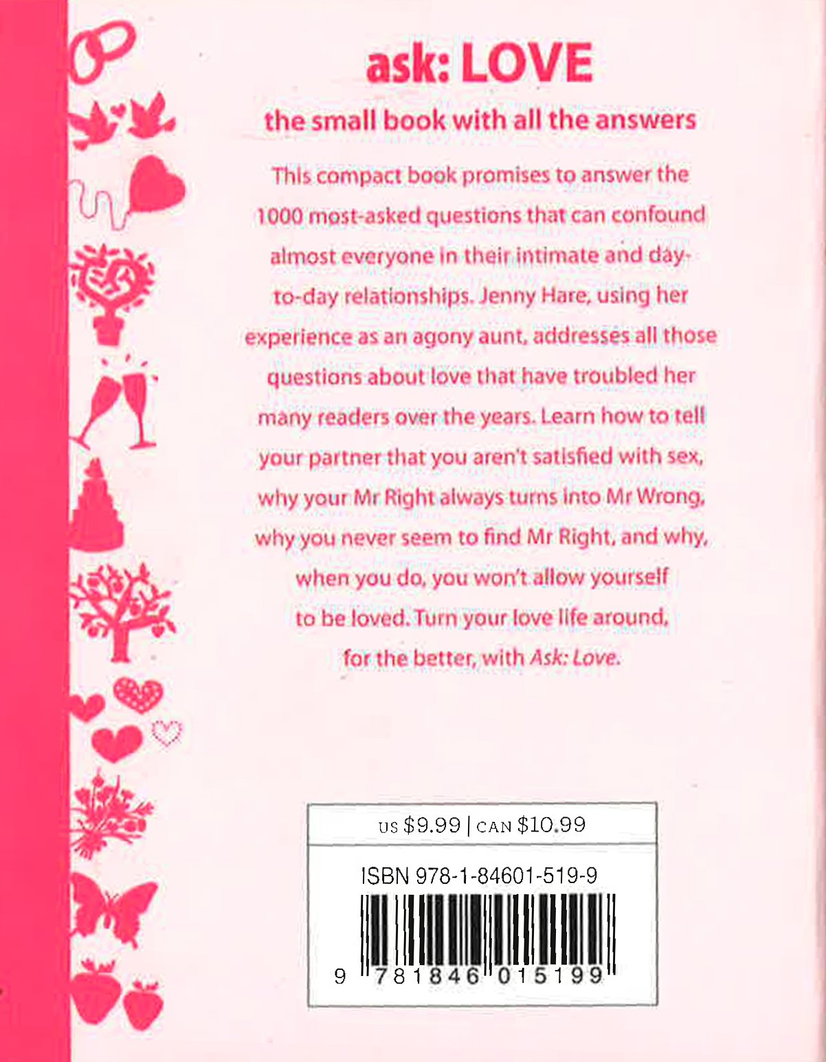 Using her experience as an agony aunt, Jenny Hare addresses all those questions of love that have troubled her many readers over the years. Learn how to tell your partner that you aren't satisfied with your love life; why your Mr Right always turns into Mr Wrong; why you never seem to find a potential Mr Right, and why, when you do, you won't allow yourself to be loved. Turn your love life around, for the better, with "Ask: Love.