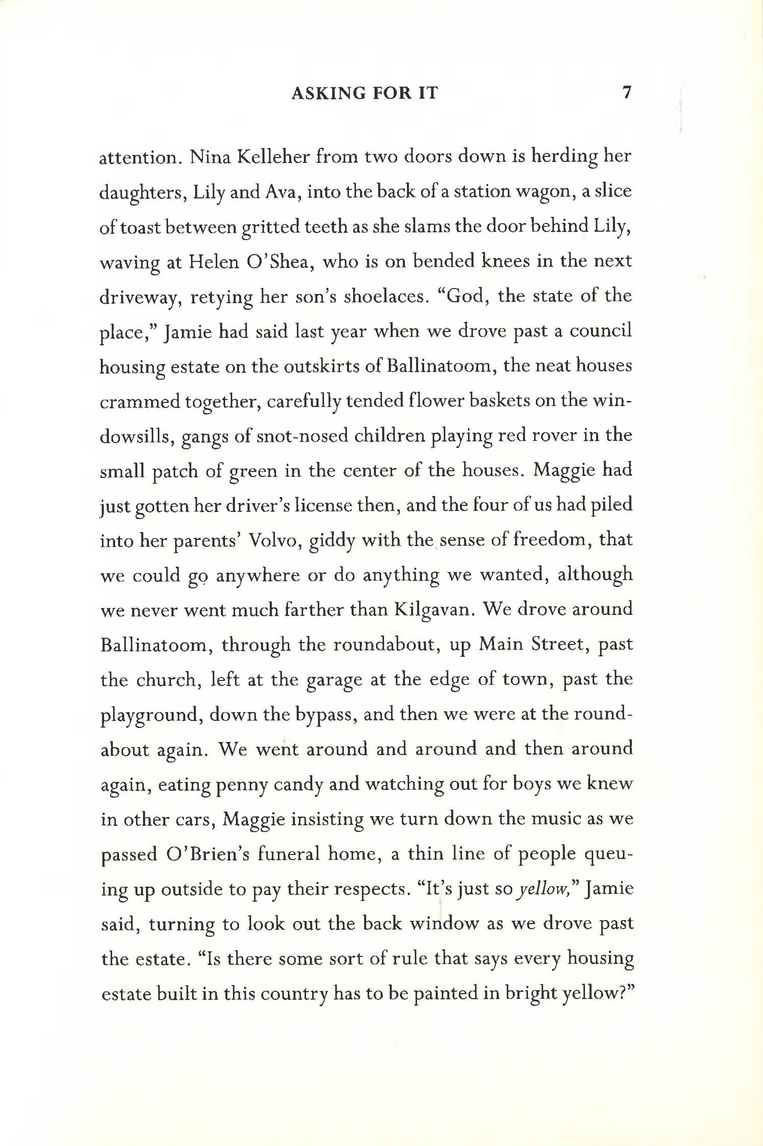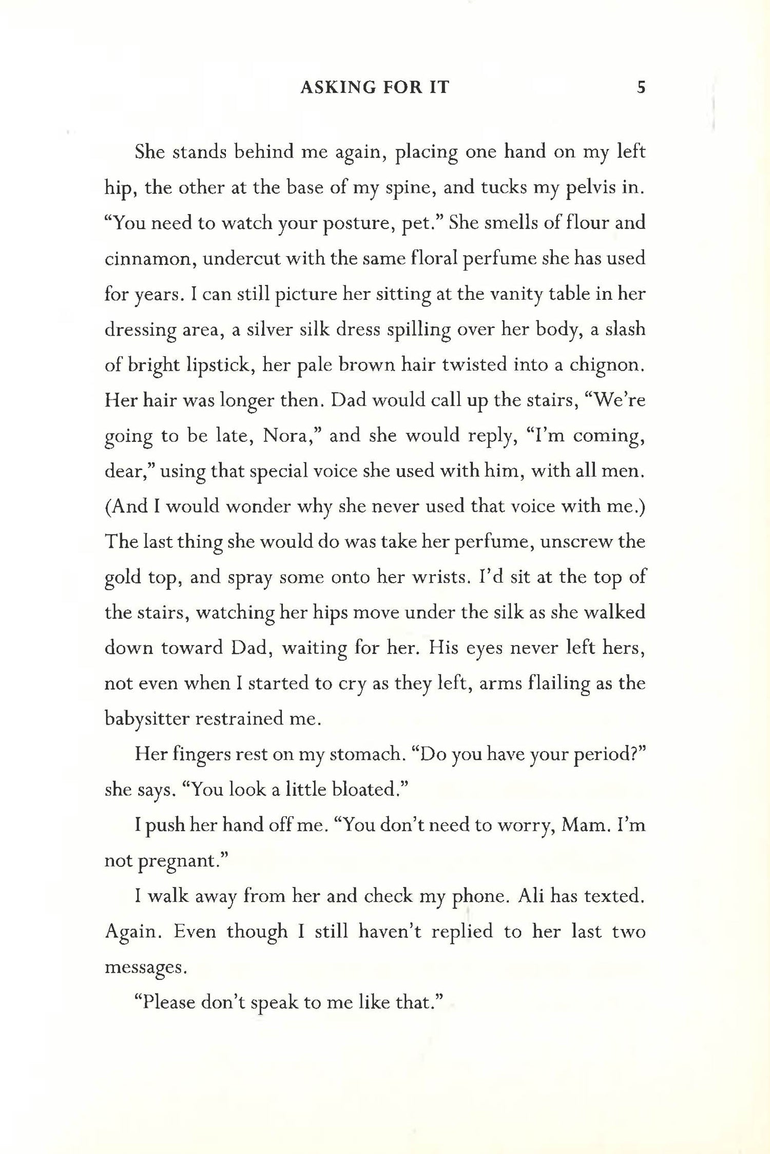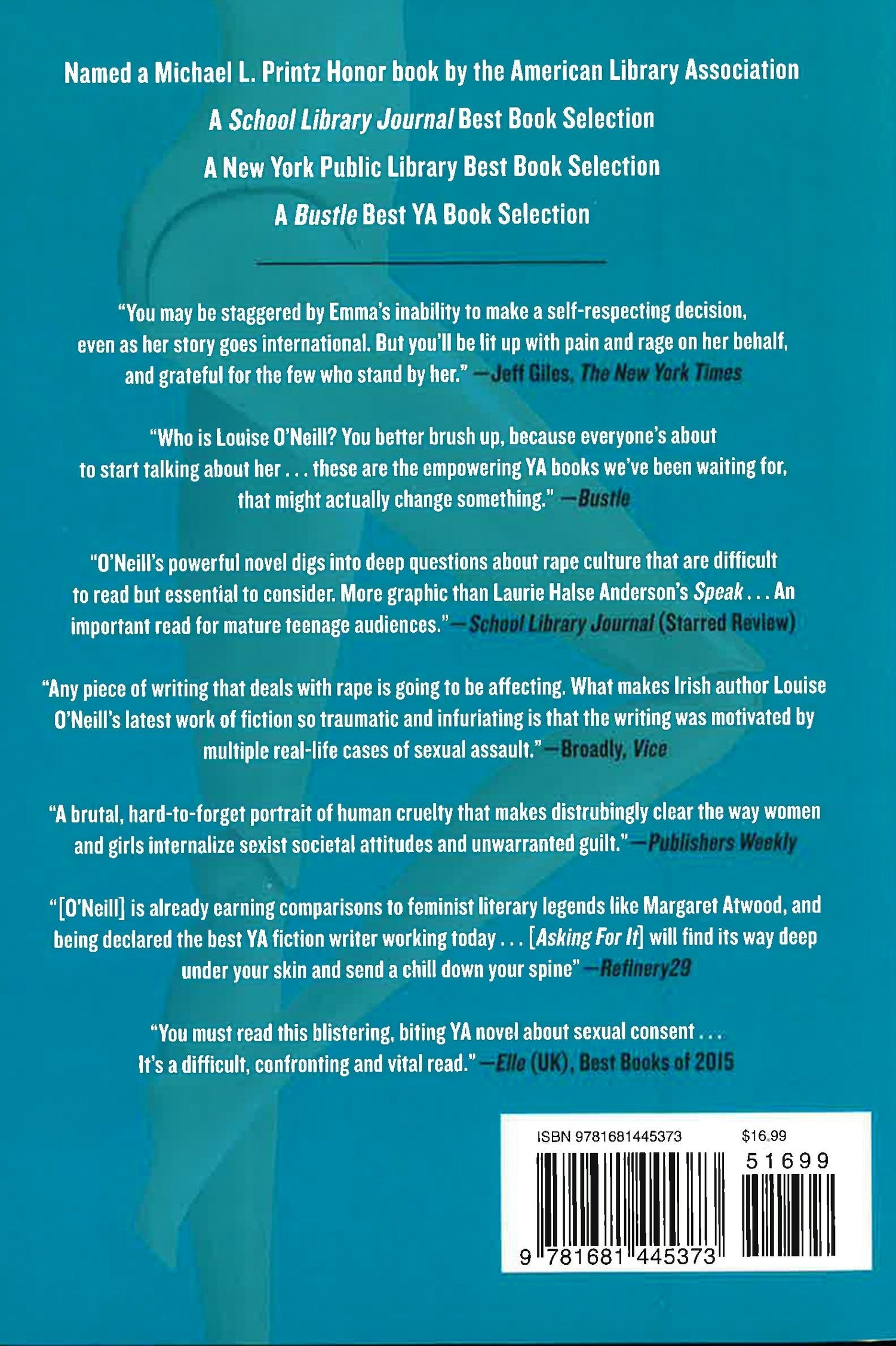 Emma O'Donovan is eighteen, beautiful, and fearless. It's the beginning of summer in a quiet Irish town and tonight she and her friends have dressed to impress. Everyone is at the party, and all eyes are on Emma.The next morning Emma's parents discover her collapsed on the doorstop of their home, unconscious. She is disheveled, bleeding, and disoriented, looking as if she had been dumped there.To her distress, Emma can't remember what happened the night before. All she knows is that none of her friends will respond to her texts. At school, people turn away from her and whisper under their breath. Her mind may be a blank as far as the events of the previous evening, but someone has posted photos of it on Facebook under a fake account, "Easy Emma"--photos she will never be able to forget.As the photos go viral and a criminal investigation is launched, the community is thrown into tumult. The media descends, neighbors chose sides, and people from all over the world want to talk about her story. Everyone has something to say about Emma.Asking For It is a powerful story about the devastating effects of rape and public shaming, told through the awful experience of a young woman whose life is changed forever by an act of violence.