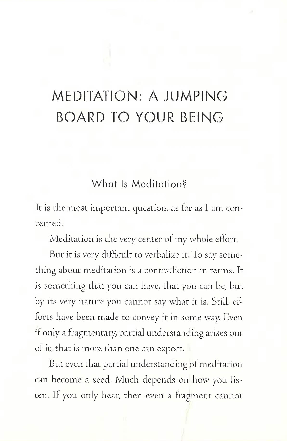 In spiritual teacher Osho's Aspects of Meditation Book 2: Meditation, a Jumping Off Point, you'll discover a deeper understanding of meditation through an investigation into the subtle workings of the mind-concentration as a way to discover the self. The West has taken to meditation with great enthusiasm. We contemplate. We concentrate. We embrace mindfulness techniques and a multitude of mantras. We have undertaken to "do" meditation. The Aspects of Meditation series is comprised of brief, precious texts in which Osho shows us the core of meditation is not about sitting silently or chanting a mantra. It is, instead, a question of understanding the subtle workings of the mind. In Book 2, Osho explores the purpose of meditation: to discover the self.