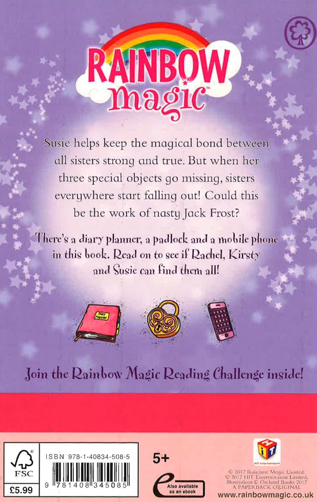Susie helps make sure the magical bond between all sisters is strong and true. But when her three special objects go missing, big and little sisters everywhere start falling out! Could this be the work of nasty Jack Frost? Rachel, Kirsty and Susie must work together to defeat him. There's a diary planner, a padlock and a mobile phone in this book. Read on to see if Rachel, Kirsty and Elsa can find them!