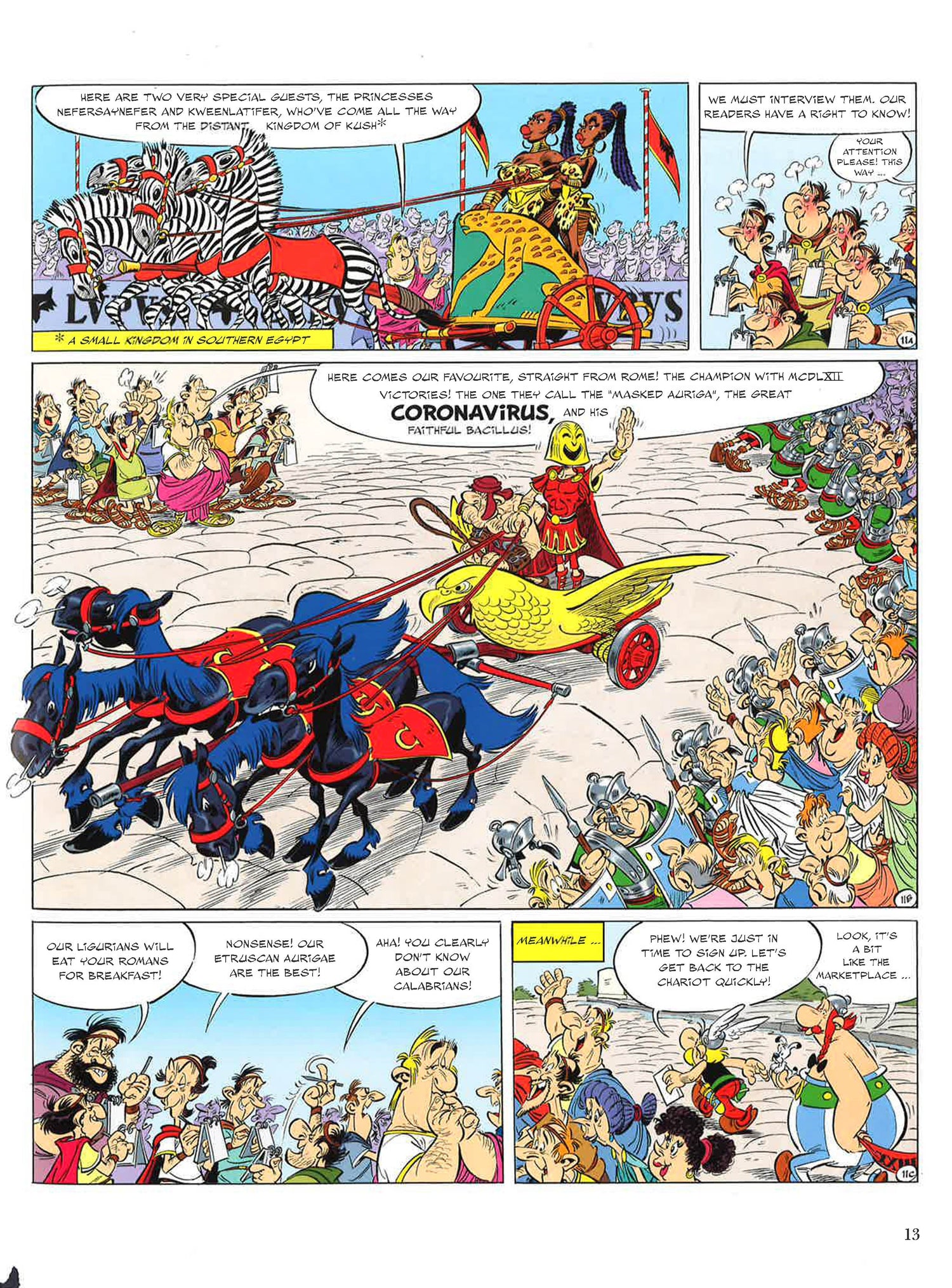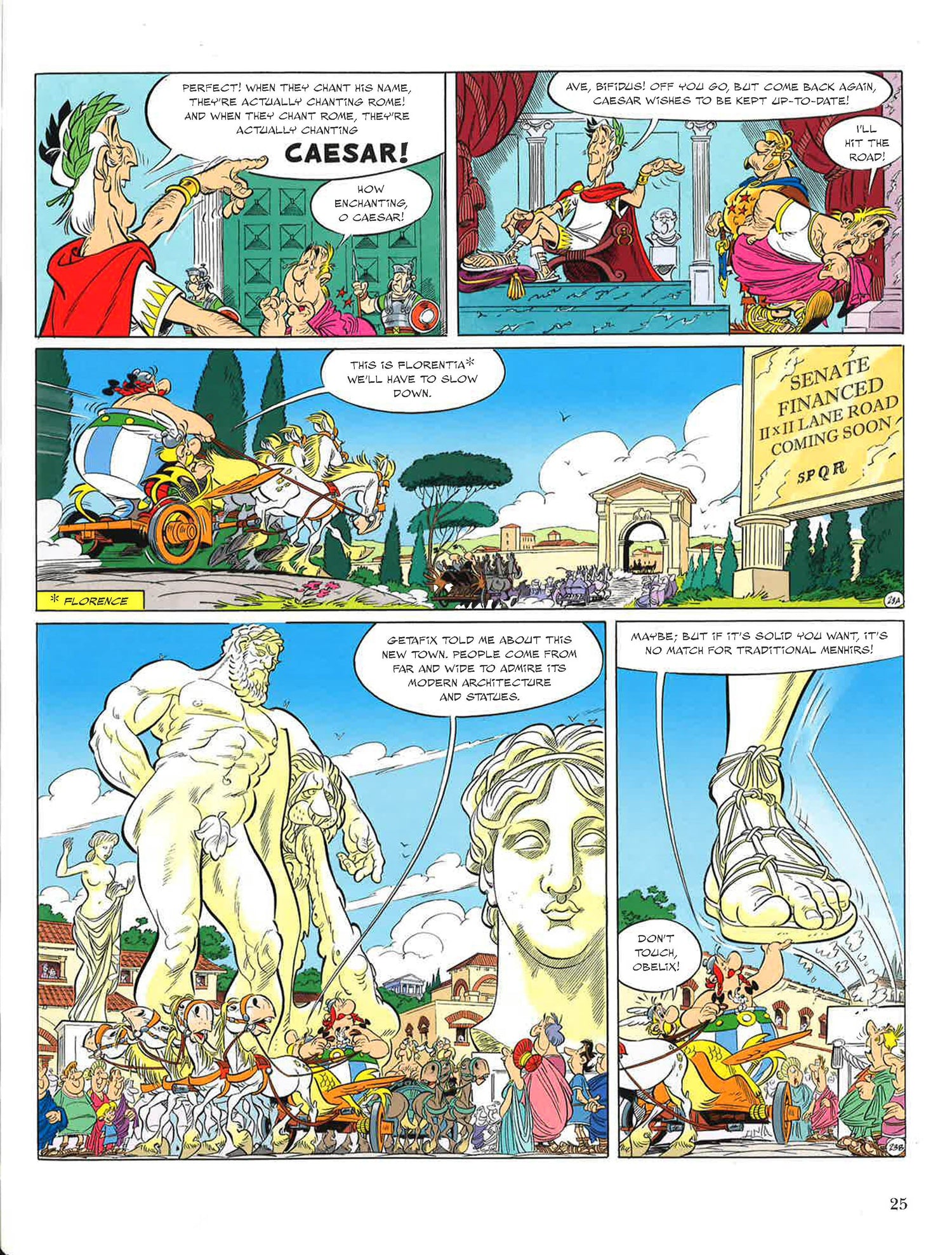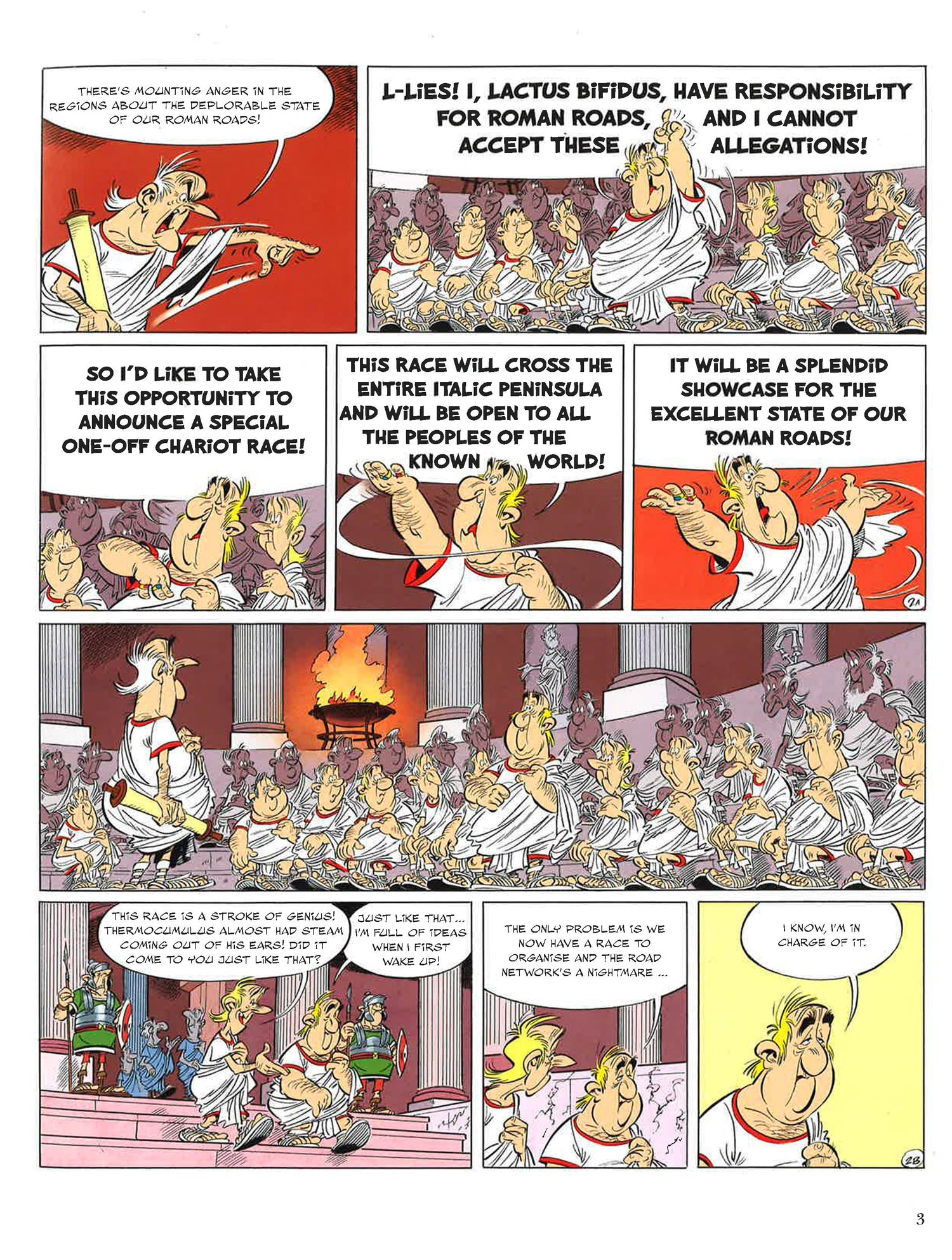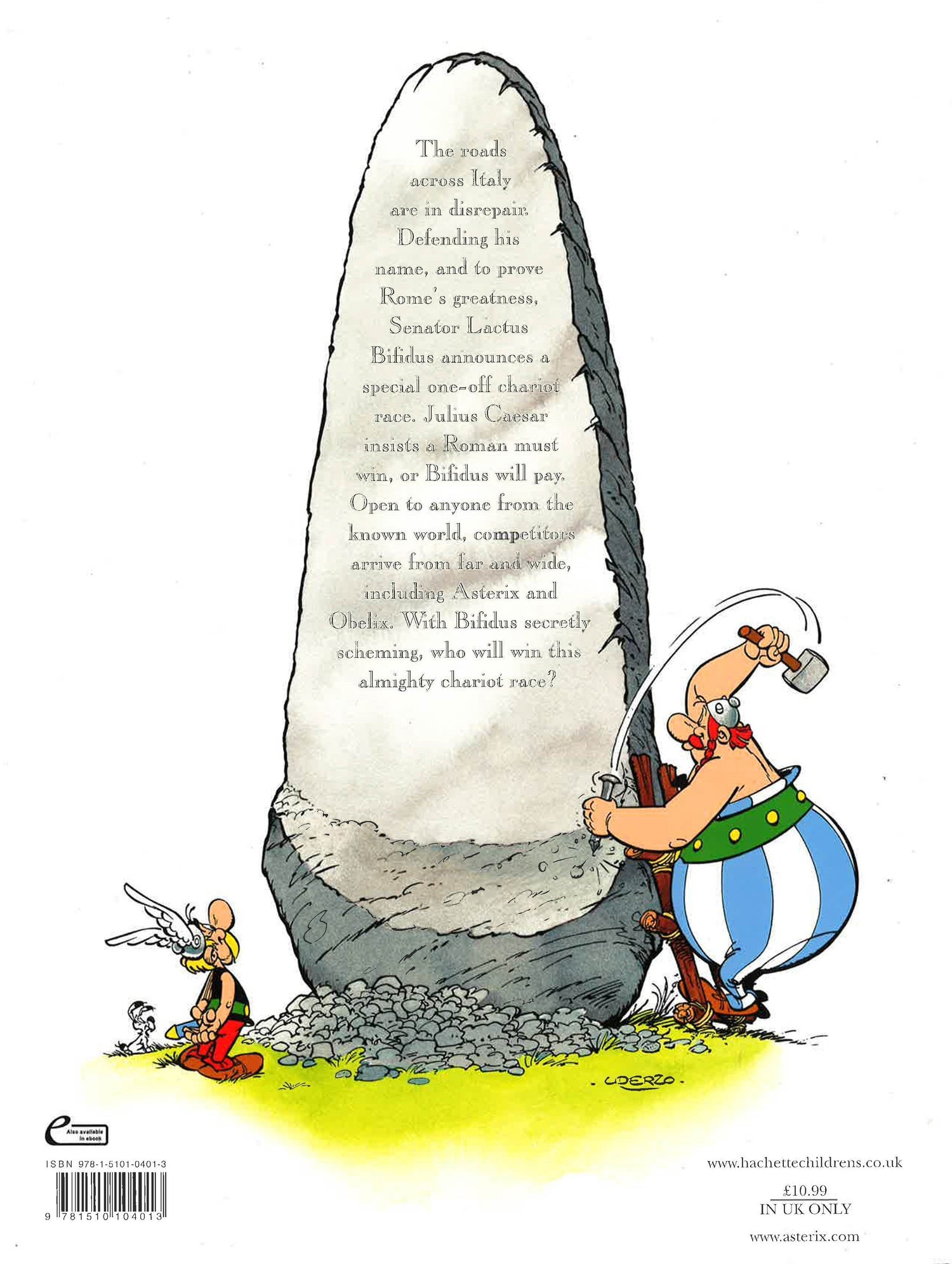 The roads across Italy are in disrepair. Defending his name, and to prove Rome's greatness, Senator Lactus Bifidus announces a special one-off chariot race. Julius Caesar insists a Roman must win, or Bifidus will pay. Open to anyone from the known world, competitors arrive from far and wide, including Asterix and Obelix. With Bifidus secretly scheming, who will win this almighty chariot race?