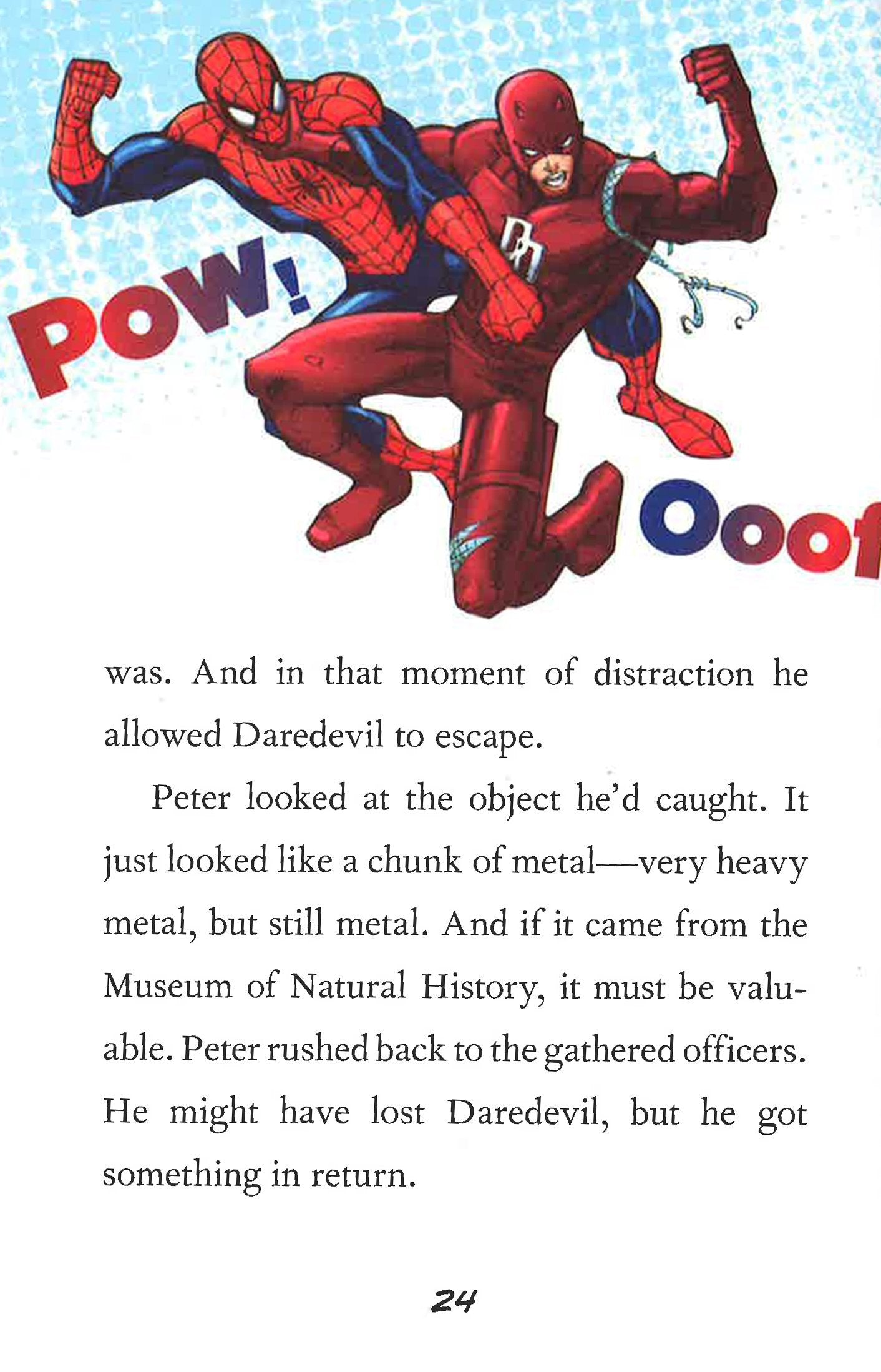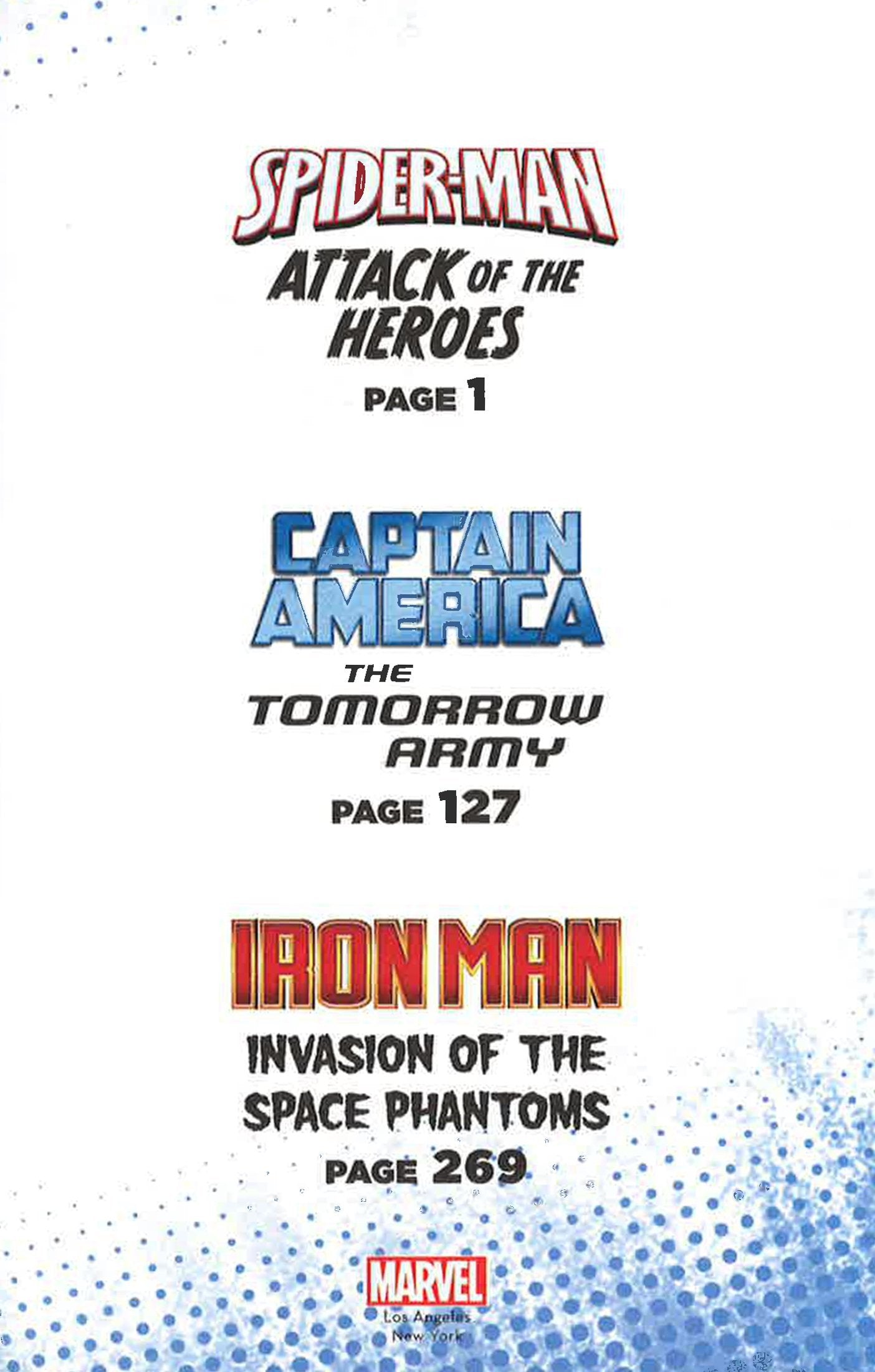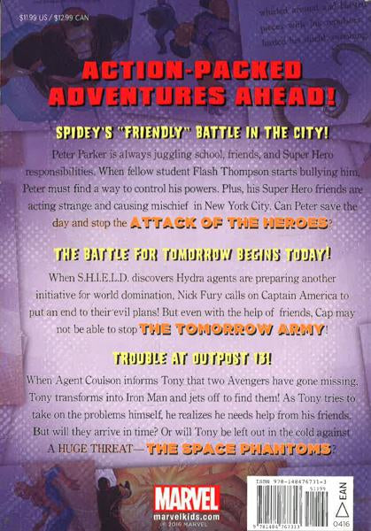 What's better than one Super Hero story...three Super Hero stories! This Mighty Marvel Chapter Book bind up features three astonishing adventures with your favorite heroes: Captain America, Spider-Man, and Iron Man. The Battle for Tomorrow Begins Today!When S.H.I.E.L.D discovers HYDRA agents are preparing another measure for world domination, Nick Fury calls on Captain America to put an end to their evil plans! But even with the help of friends, Cap may not be able to stop TTHHEE TOMOORROW ARMY! Spidey's "Friendly" Battle in the City!Peter Parker is always juggling school, friends, and being a Super Hero. So, when fellow student, Flash Thompson, starts bullying him he must find a way to control his powers. Plus, his Super Hero friends are acting strange and causing mischief in New York City. Can Peter save the day and stop the ATTACK OF THE HEROES? Trouble at Outpost 13!When S.H.I.E.L.D. informs Tony that Avengers have gone missing, Tony transforms into Iron Man and jets off to the rescue! As Tony tries to take on the problems himself, he realizes he needs help from his friends. But will they arrive in time? Or will Tony be left out in the cold against A HUGE THREAT-THE SPACE PHANTOMS!