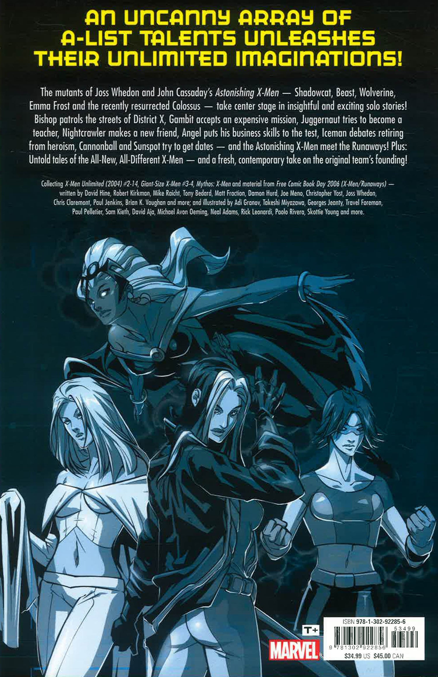 An uncanny array of A-list talents unleashes their unlimited imaginations on the mutants of Joss Whedon and John Cassaday's ASTONISHING X-MEN! Shadowcat, Beast, Wolverine, Emma Frost and the recently resurrected Colossus take center stage in insightful and exciting solo stories! Plus, Bishop patrols the streets of District X, Gambit takes on an expensive mission, Juggernaut tries to become a teacher, Nightcrawler makes a new friend, Angel puts his business skills to the test, Iceman debates retiring from heroism, Cannonball and Sunspot try to get a date - and the astonishing X-Men meet the Runaways! Plus, untold tales of the All-New, All-Different X-Men - and a fresh and contemporary take on the founding of the original team!