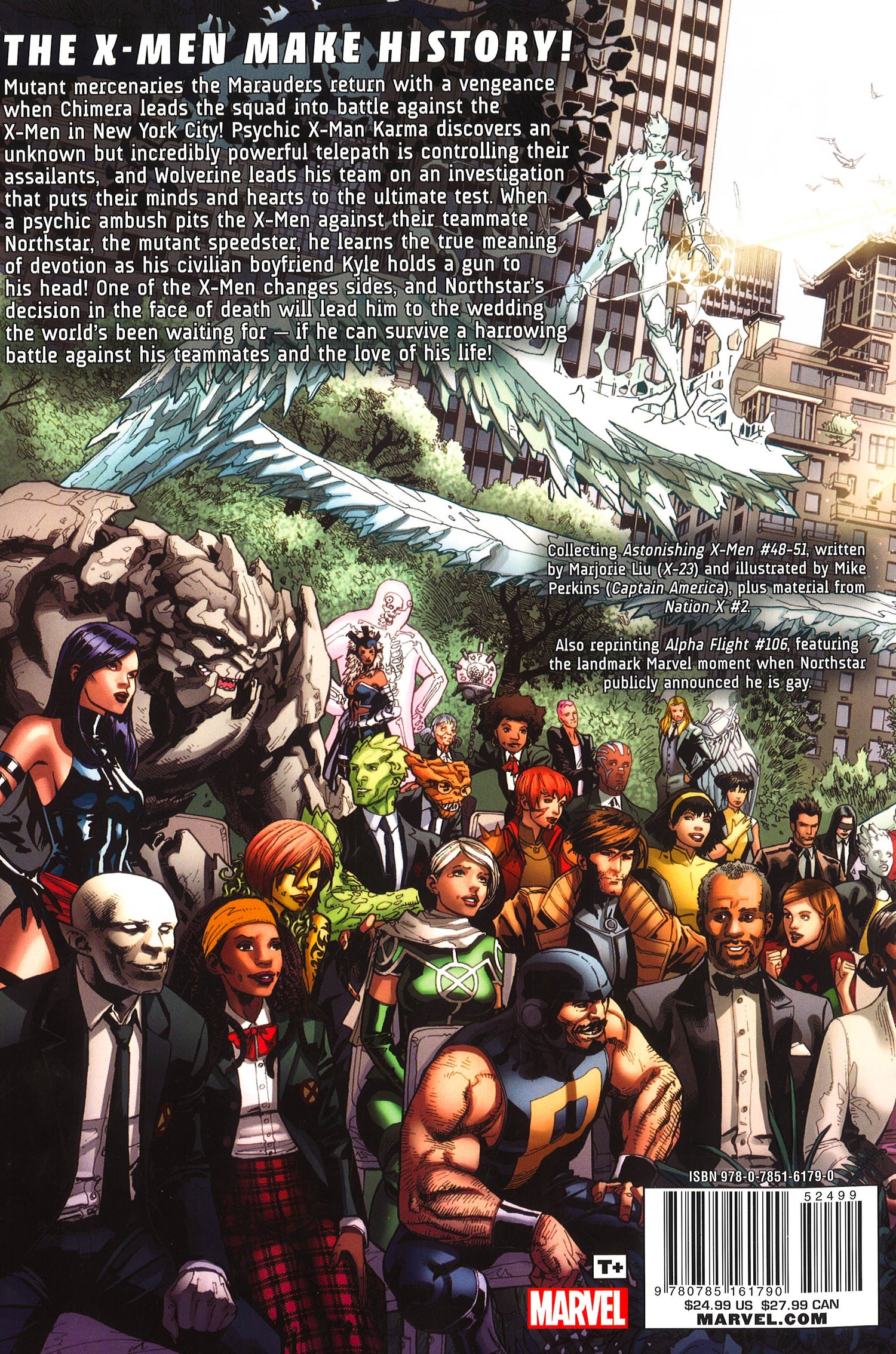 The X-Men return to New York City, but it's not a social call - the Marauders are back! Something from Northstar's past has resurfaced and is looking for revenge - and when his boyfriend Kyle goes missing, will Northstar choose him or the team? Plus: Karma is losing control of her mind and taking control of the other X-Men - but all that pales in comparison to how this story ends! Collecting ASTONISHING X-MEN (2004) #48-51 and material from NATION X #2.
