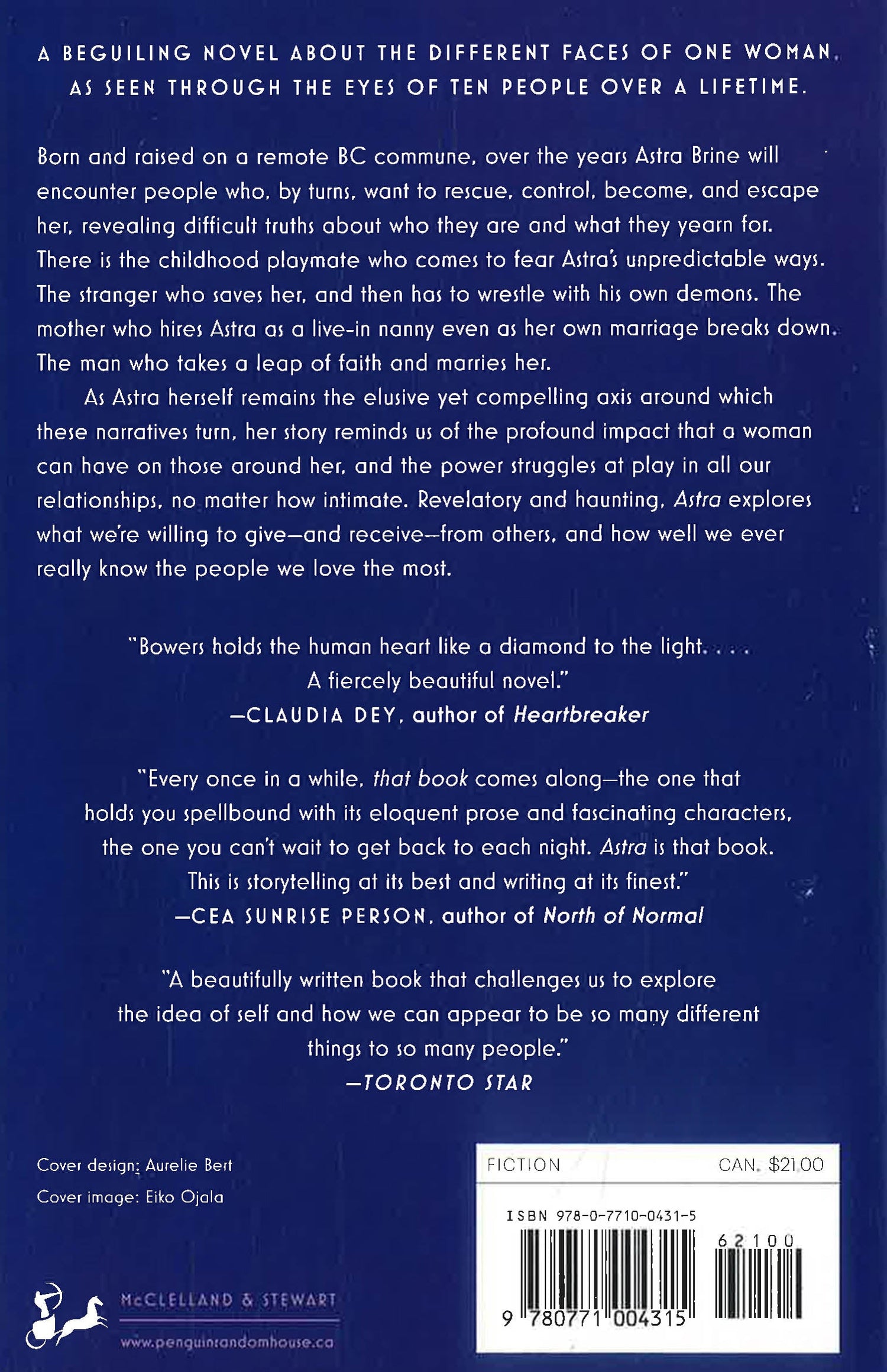What if you could see yourself as others see you? Astra is a beguiling debut novel that reveals the different faces of one woman, as seen through the eyes of ten people over a lifetime. Longlisted for the Scotiabank Giller Prize, shortlisted for the Ethel Wilson Fiction Prize, and named a Best Book of the Year by the Globe and Mail, Winnipeg Free Press, and CBC Books.