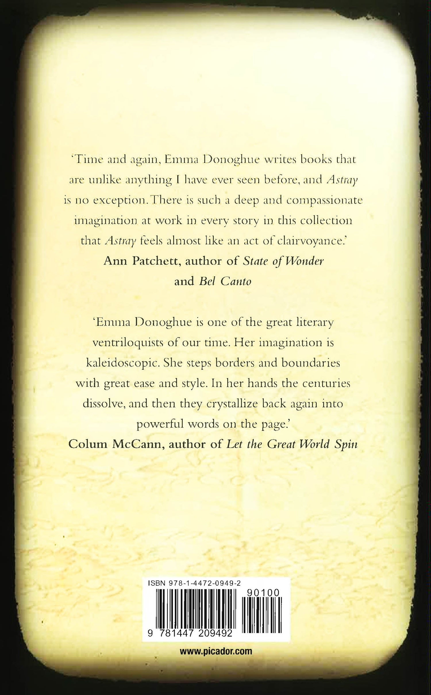 Counterfeiter. Dishwasher. Prostitute. Attorney. Sculptor. Mercenary. Elephant. Corpse. The fascinating characters that roam across the pages of Emma Donoghue's latest fact-inspired fictions have all gone astray: they are emigrants, runaways, drifters. They cross other borders, too: those of race, law, sex and sanity. They travel for love or money, incognito or under duress. Donoghue describes the brutal plot hatched by a slave in conjunction with his master's wife to set them both free; she draws out the difficulties of gold mining in the Yukon, even in the supposedly plentiful early days, and she takes us to an early Puritan community in Massachusetts unsettled by an invented sex scandal. Astray also includes 'The Hunt', a shocking confession of one soldier's violent betrayal during the American Revolution, which has been shortlisted for the 2012 Sunday Times Short Story Award. Astray is a sequence of fourteen stories by the prize-winning author of Room and The Sealed Letter. These strange, true tales light up four centuries of wanderings, offering a past made up of deviations, and a surprising and moving history for restless times.
