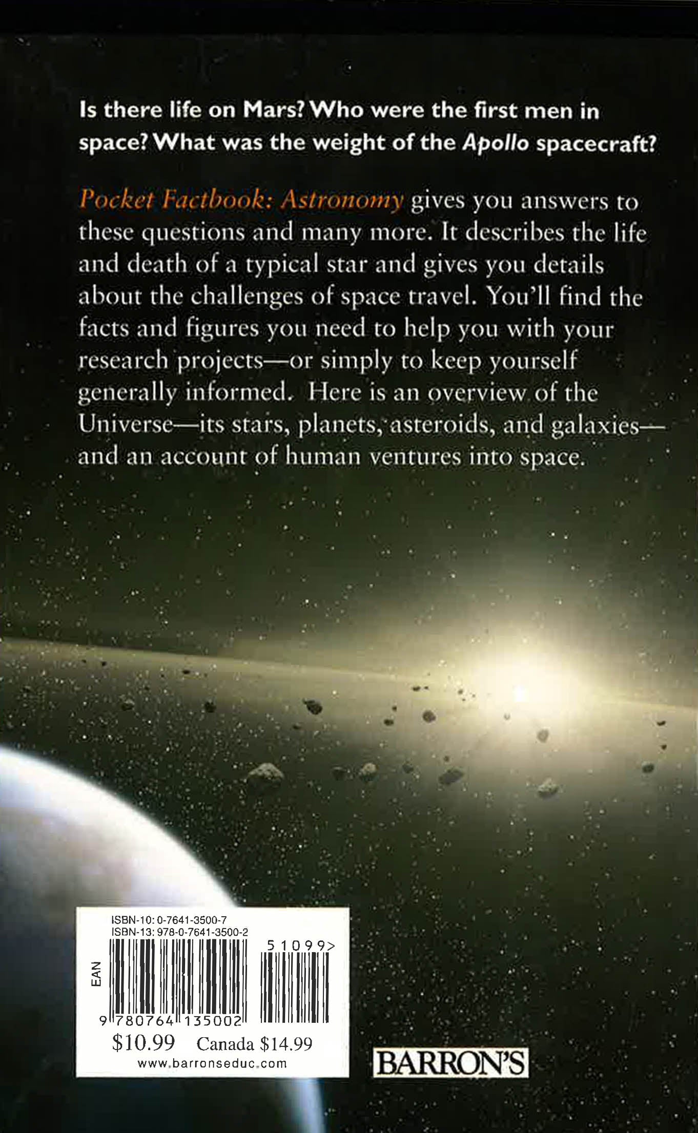 Is there life outside the Earth? What is a black hole? What was the weight of the Apollo spacecraft? This compact guide presents essential facts about the solar system, galaxies in deep space, manned space flights, space stations and probes, and much more. Each title in "Barron's Pocket Factbooks " seroes focuses on one of the natural or social sciences. It presents fascinating, sometimes little-known facts about its subject, as well as answers to frequently asked questions. These books make handy reference sources for students, freelance writers, and general readers who are interested in finding out the how, where, when, and why the specific facts and details relating to science, technology, natural history, and social history. All titles in this series are filled with attractive color photos and illustrations.