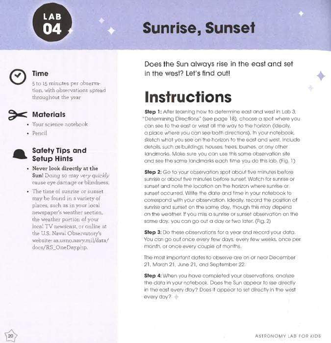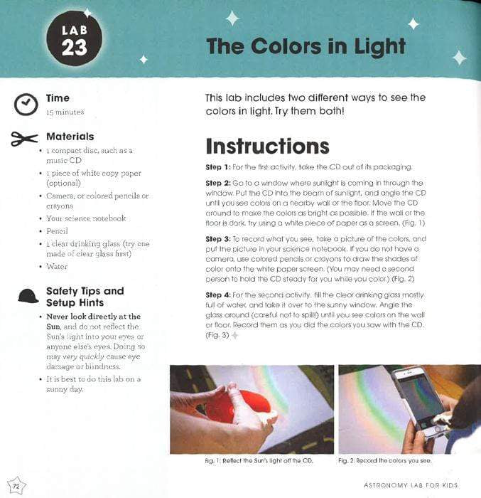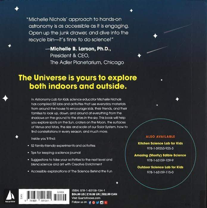 Explore the wonders of the universe through hands-on fun! In Astronomy Lab for Kids, science educator Michelle Nichols has compiled 52 labs and activities that use everyday materials from around the house to encourage kids, their friends, and their families to look up, down, and around at everything from the shadows on the ground to the stars in the sky. Mini astronomers will learn about things such as the size and scale of planets using sandwich cookies and tennis balls, how to measure the speed of light with a flat candy bar and a microwave, how to make a simple telescope with magnifying glasses, and so much more! Kids begin their journey through the stars by creating a science journal to track their experiments and record their observations. Foundational skills, like how to make observations, measure angles, and determine directions, are laid out first. The lessons expand with explorations of size and scale; light, motion, and gravity; and then on to investigations of our Solar System and finding constellations in the night sky. Each lab includes: Time it will take to complete Materials list Safety tips and setup hints Step-by-step text and photos The science behind the fun Variations or ideas for taking the project further Children of all ages and experience levels will love the hands-on activities and adults will love spending quality time learning with their kids or students. The popular Lab for Kids series features a growing list of books that share hands-on activities and projects on a wide host of topics, including art, astronomy, clay, geology, math, and even how to create your own circus-all authored by established experts in their fields. Each lab contains a complete materials list, clear step-by-step photographs of the process, as well as finished samples. The labs can be used as singular projects or as part of a yearlong curriculum of experiential learning. The activities are open-ended, designed to be explored over and over, often with different results. Geared toward being taught or guided by adults, they are enriching for a range of ages and skill levels. Gain firsthand knowledge on your favorite topic with Lab for Kids.