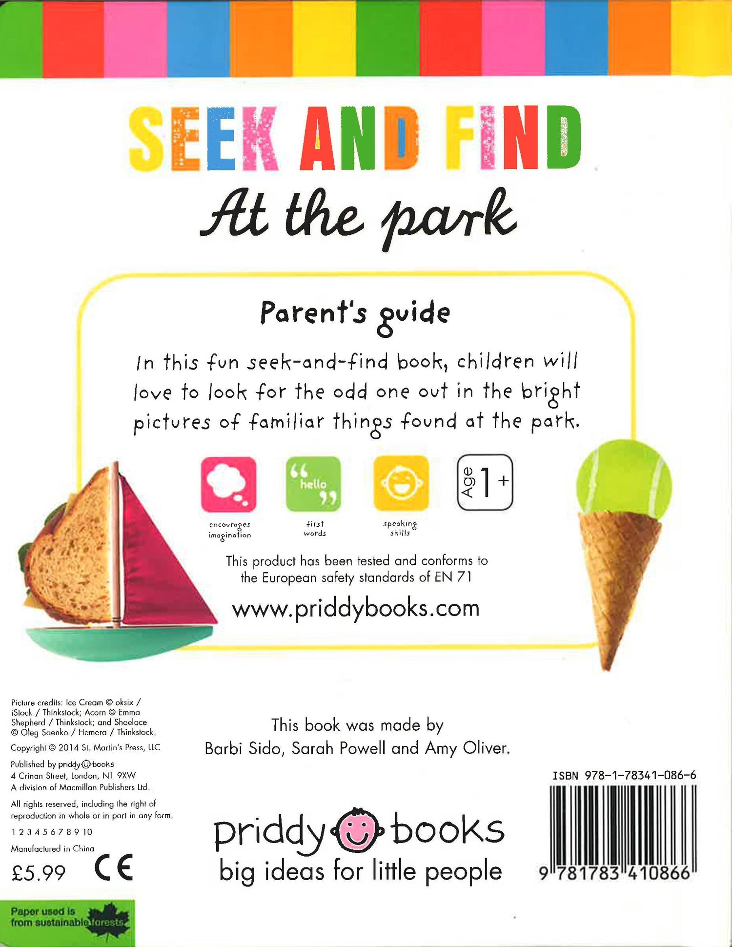 The pages have repeated photographs of things that children will recognise from trips to the park - but one picture is different to the rest! Rhymes offer clues and act as a prompt for children to discover which picture is the odd one out. Classic Priddy photographic early learning board books which help to develop matching and observational skills