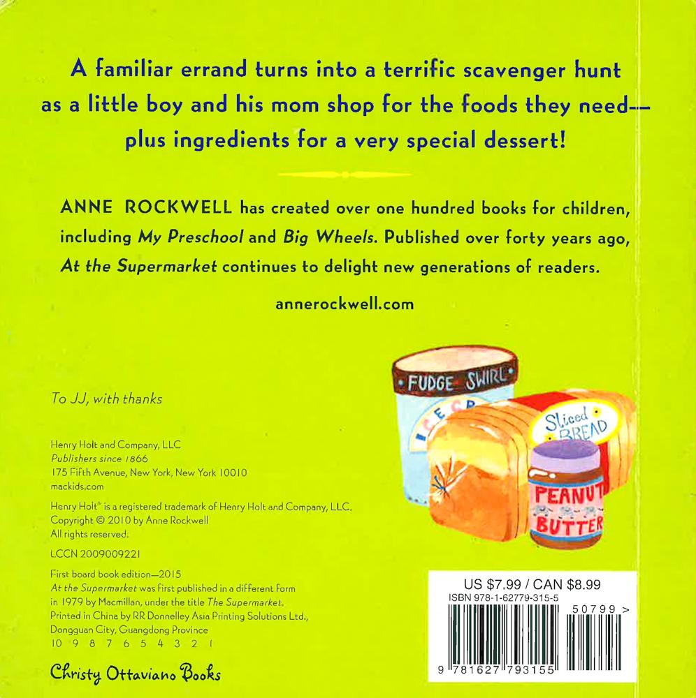 On a special trip to the supermarket, a young boy helps his mom buy what they need. There are meats, fruits, and vegetables to put in the shopping cart; soap and toilet paper, too. But the most important ingredients are those needed to bake a birthday cake. Children love to help out at the grocery store. In her signature style, Anne Rockwell conveys the adventure of a trip to the supermarket from a young child's point-of-view.