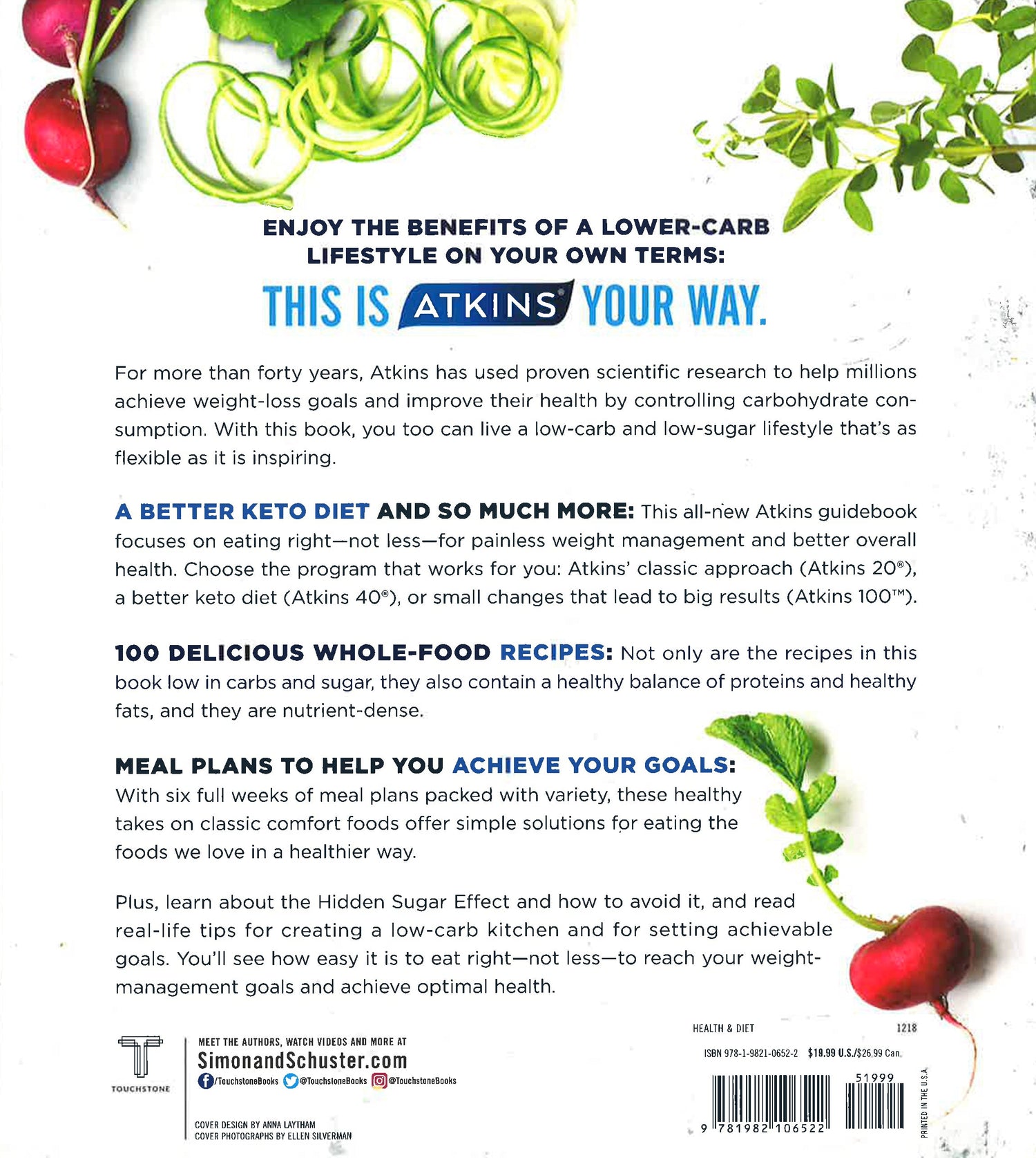 Enjoy the benefits of a lower-carb lifestyle on your own terms--including a better keto diet: This is Atkins(R) your way. For more than forty years, Atkins has used proven scientific research to help millions achieve weight-loss goals and improve their health by controlling carbohydrate consumption. Dr. Atkins actually introduced the concept of "ketosis" to the general public in 1972 in his first book, Dr. Atkins' Diet Revolution. With this book, you too can live a low-carb and low-sugar lifestyle that's as flexible as it is inspiring. A BETTER KETO DIET AND SO MUCH MORE: This all-new Atkins guidebook focuses on eating right--not less--for painless weight management and better overall health. Choose the program that works for you: Atkins' classic approach (Atkins 20(R)), a better keto diet (Atkins 40(R)), or small changes that lead to big results (Atkins 100(TM)). 100 DELICIOUS WHOLE-FOOD RECIPES: Not only are the recipes in this book low in carbs and sugar, they contain a healthy balance of proteins and healthy fats, and they are nutrient-dense. MEAL PLANS TO HELP YOU ACHIEVE YOUR GOALS: Six full weeks of meal plans packed with variety, these healthy takes on classic comfort foods offer simple solutions for eating the foods we love in a healthier way. Plus, learn about the Hidden Sugar Effect and how to avoid it, and read real-life tips for creating a low-carb kitchen and for setting achievable goals. You'll see how easy it is to eat right--not less--to reach your weight-management goals and achieve optimal health.