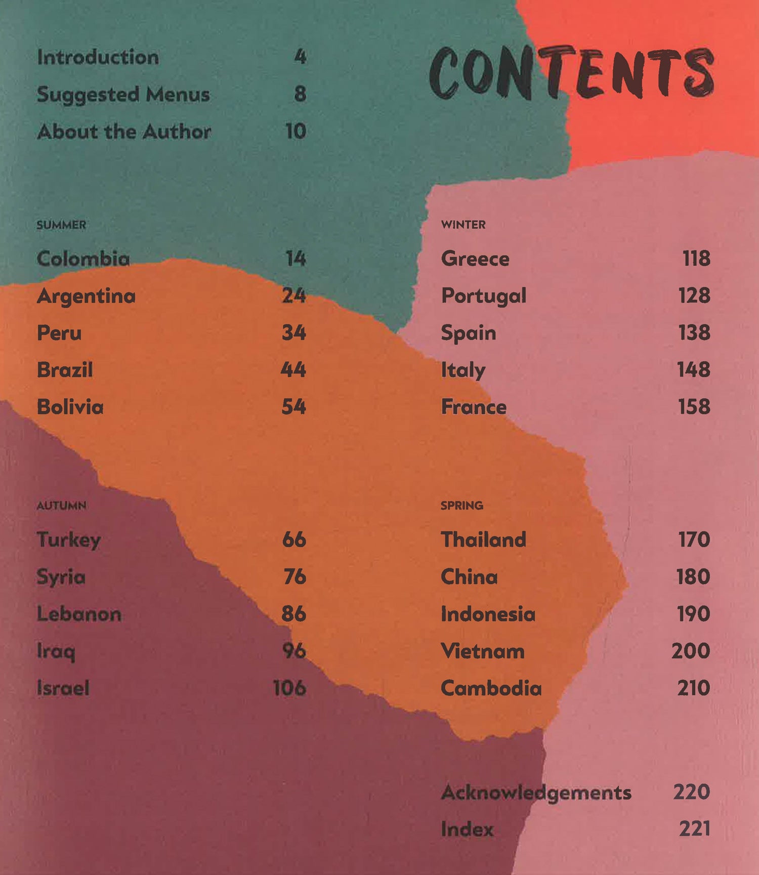 ?Featuring food from: Argentina, Bolivia, Brazil, Cambodia, China, Colombia, France, Greece, Indonesia, Iraq, Israel, Italy, Lebanon, Peru, Portugal, Spain, Syria, Thailand, Turkey and Vietnam.