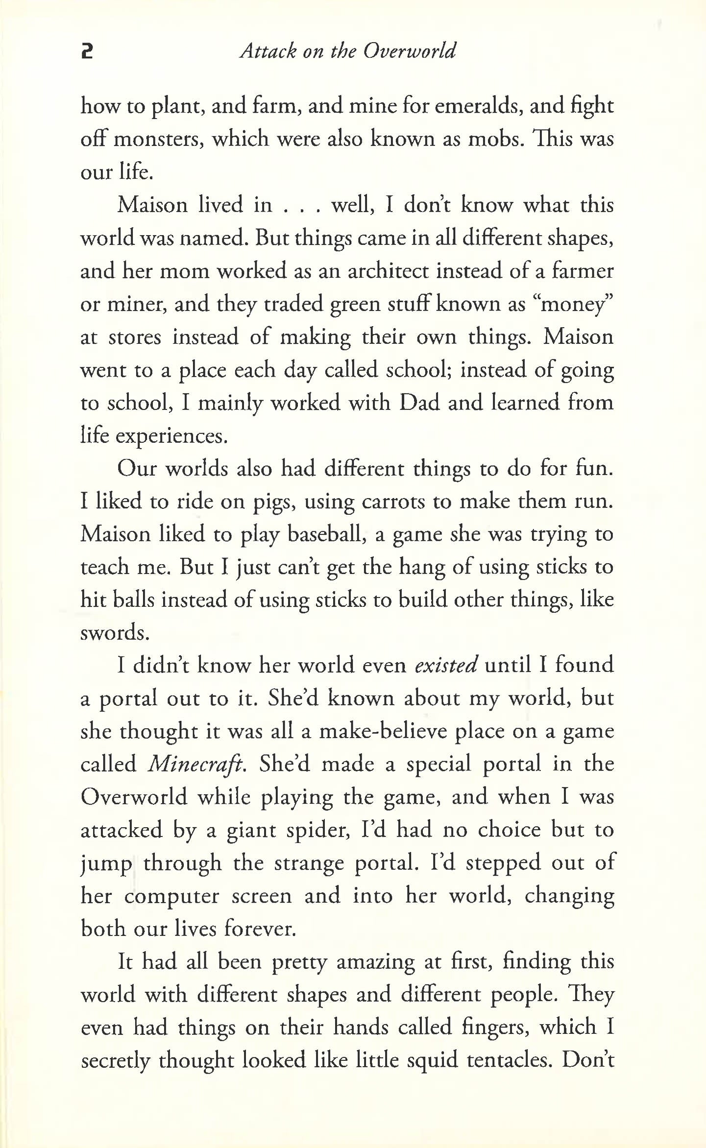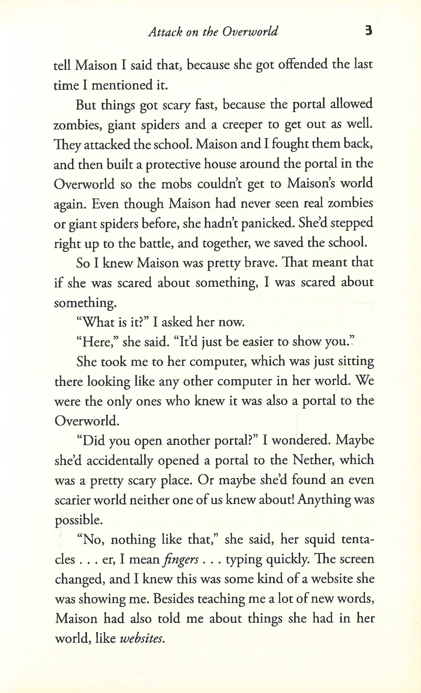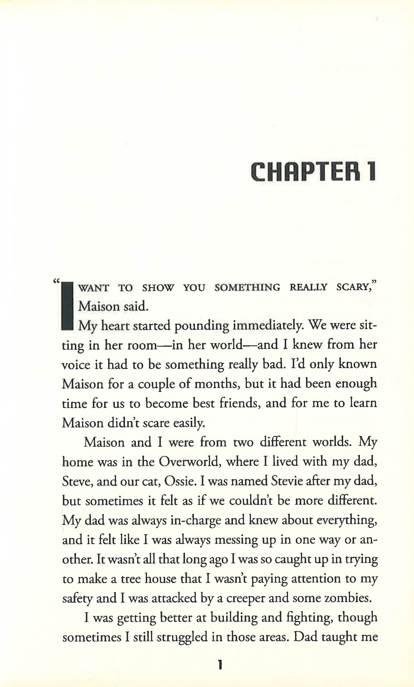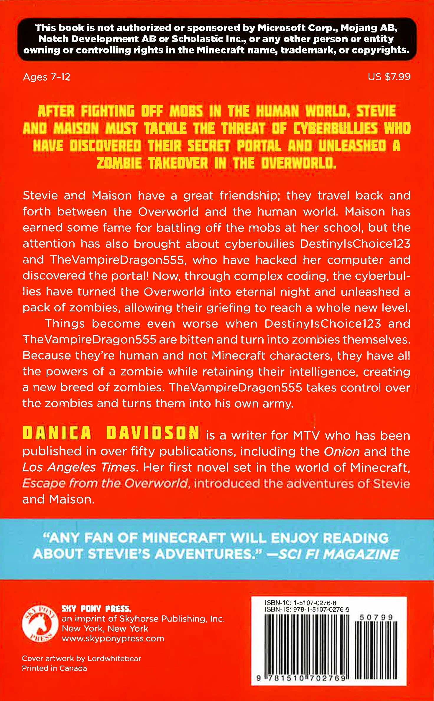 Stevie and Maison have a great friendship where they travel back and forth between the Overworld and the human world. Maison has earned some fame for battling off the mobs at her school, but the attention has also brought about cyberbullies DestinyIsChoice123 and TheVampireDragon555, who have hacked her computer and discovered the portal! Now, through complex coding, the cyberbullies have turned the Overworld into eternal night and unleashed a pack of zombies, allowing their griefing to reach a whole new level. Things become even worse when DestinyIsChoice123 and TheVampireDragon555 are bitten and turn into zombies themselves. Because they're human and not Minecraft characters, they have all the powers of a zombie while retaining their intelligence, creating a new breed of zombies. TheVampireDragon555 is even able to control and rule over the zombies, letting him raise his own army. Stevie and Maison run for the village to warn everyone, but it's too late: all the villagers have been turned into zombies. In the midst of the eternal night they'll have to fight off zombies, and find supplies to make potions to save the villagers and the Overworld.