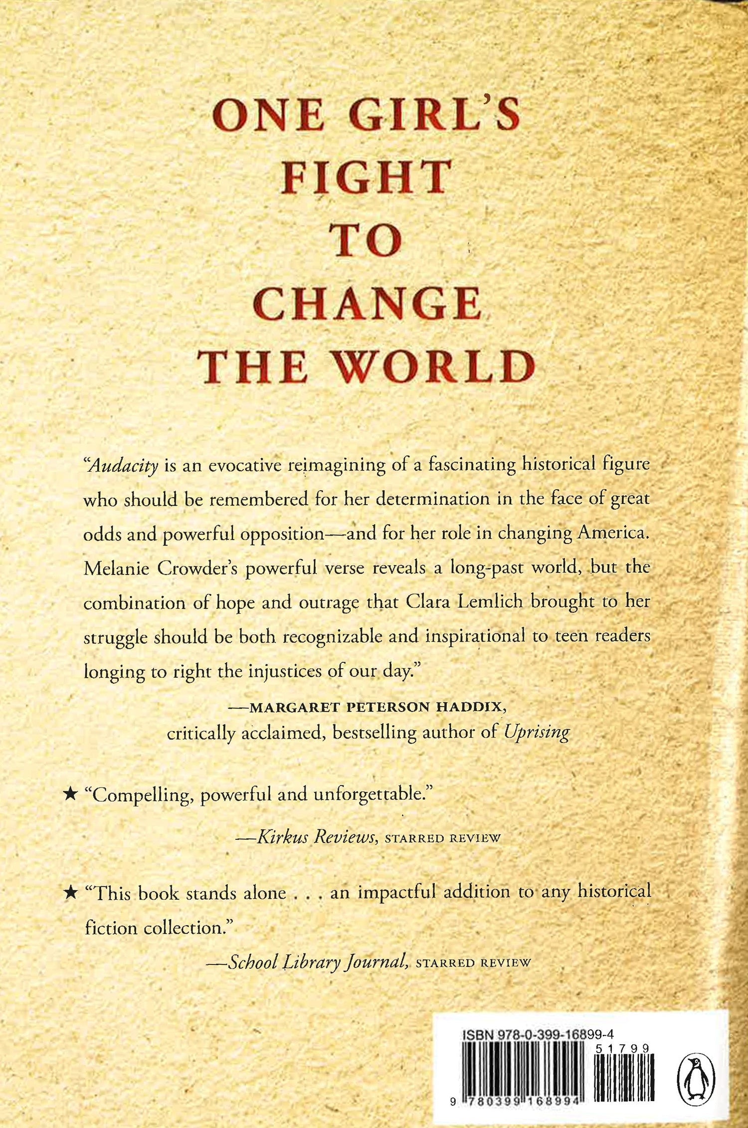 A 2015 National Jewish Book Award finalist The inspiring story of Clara Lemlich, whose fight for equal rights led to the largest strike by women in American history A gorgeously told novel in verse written with intimacy and power, Audacity is inspired by the real-life story of Clara Lemlich, a spirited young woman who emigrated from Russia to New York at the turn of the twentieth century and fought tenaciously for equal rights. Bucking the norms of both her traditional Jewish family and societal conventions, Clara refuses to accept substandard working conditions in the factories on Manhattan's Lower East Side. For years, Clara devotes herself to the labor fight, speaking up for those who suffer in silence. In time, Clara convinces the women in the factories to strike, organize, and unionize, culminating in the famous Uprising of the 20,000. Powerful, breathtaking, and inspiring, Audacity is the story of a remarkable young woman, whose passion and selfless devotion to her cause changed the world. Praise for AUDACITY: A 2015 National Jewish Book Award finalist A Washington Post Best Children's Books for April: Poetry Edition An ILA Notable Book for a Global Society A 2016 NCTE Children's Notable Verse Novel A New York Public Library Best Book for Teens An ALA Top 10 Best Fiction for Young Adults Pick An ALSC Notable Children's Book nominee A BCCB Blue Ribbon winner * "Crowder breathes life into a world long past....Compelling, powerful and unforgettable." --Kirkus Reviews, starred review * "This book stands alone....an impactful addition to any historical fiction collection."--School Library Journal, starred review * "With a thorough historical note, glossary of terms, and bibliography, this will make an excellent complement to units on women's rights and the labor movement, but it will also satisfy readers in search of a well-told tale of a fierce heroine."--BCCB, starred review * "This is an excellent title that can open discussions in U.S. history and economics courses about women's rights, labor unions, and the immigrant experience."--School Library Connection, starred review "Based on the true story of Clara Lemlich, Audacity throbs with the emotions of this exceptional young woman who fought for equal rights and improved labor standards in factories. Melanie Crowder's verses spit out Clara's rage, cradle her longing and soar like the birds that are her constant companions."--Bookpage "Crowder's (Parched) use of free verse in this fictionalization of Russian-Jewish immigrant Clara Lemlich's life brings a spare poignancy to a familiar history."--Publishers Weekly "Brilliant, riveting, informative." --Cynthia Levinson, critically acclaimed author of We've Got a Job "Audacity is an evocative reimagining of a fascinating historical figure who should be remembered for her determination in the face of great odds and powerful opposition--and for her role in changing America. Melanie Crowder's powerful verse reveals a long-past world, but the combination of hope and outrage that Clara Lemlich brought to her struggle should be both recognizable and inspirational to teen readers longing to right the injustices of our day."--Margaret Peterson Haddix, critically acclaimed, bestselling author of Uprising *This book may have remainder mark*