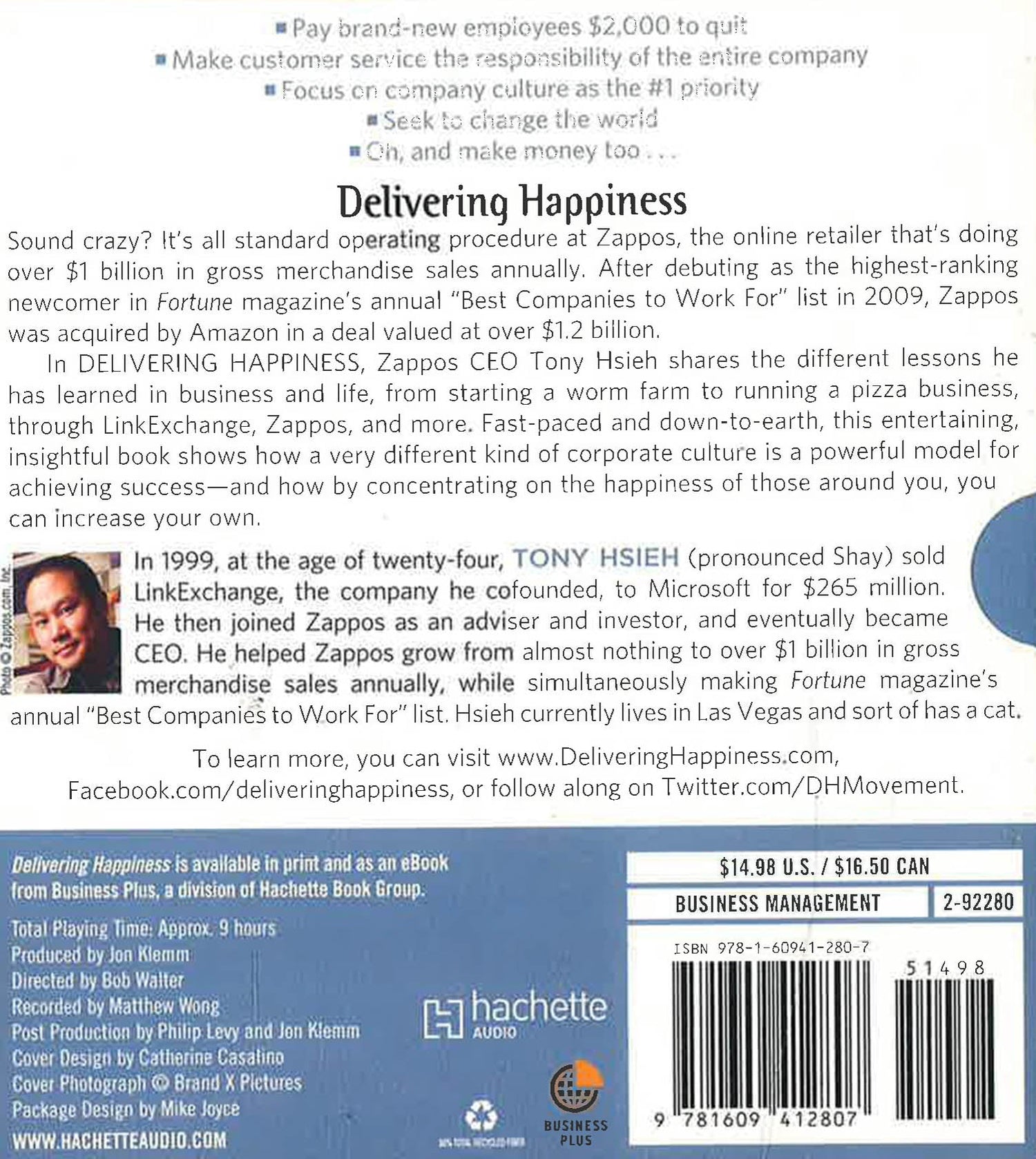 In his first audiobook, Tony Hsieh - the widely-admired CEO of on-line shoe retailer, Zappos, explains how he created a unique culture and commitment to service that aims to improve the lives of its employees, customers, vendors and backers. Using anecdotes and stories from his own experiences and from other companies, Hsieh provides concrete ways that companies can achieve unprecedented success. Even better, he shows how creating happiness and record results go hand-in-hand. He starts with the 'Why' in a section where he narrates his quest to understand the science of happiness. Then he runs through the ten Zappos 'Core Values' such as 'Deliver WOW through Service,' 'Create Fun and A Little Weirdness' and 'Build a Positive Team and Family Spirit' and explains how you and your colleagues should come up with your own. Hsieh then details many of the unique practices at Zappos that have made it the success it is today, such as the philosphy of allocating marketing money into the customer experience, thereby allowing repeat customers and word-of-mouth be their true form of marketing. He also explains why Zappos's main priority is company culture and his belief that once you get the culture right, everything else - great customer service, long-term branding - will happen on its own. Finally, Hsieh explains how Zappos employees actually apply the Core Values to improving their lives outside of work - and to making a difference in their communities and the world