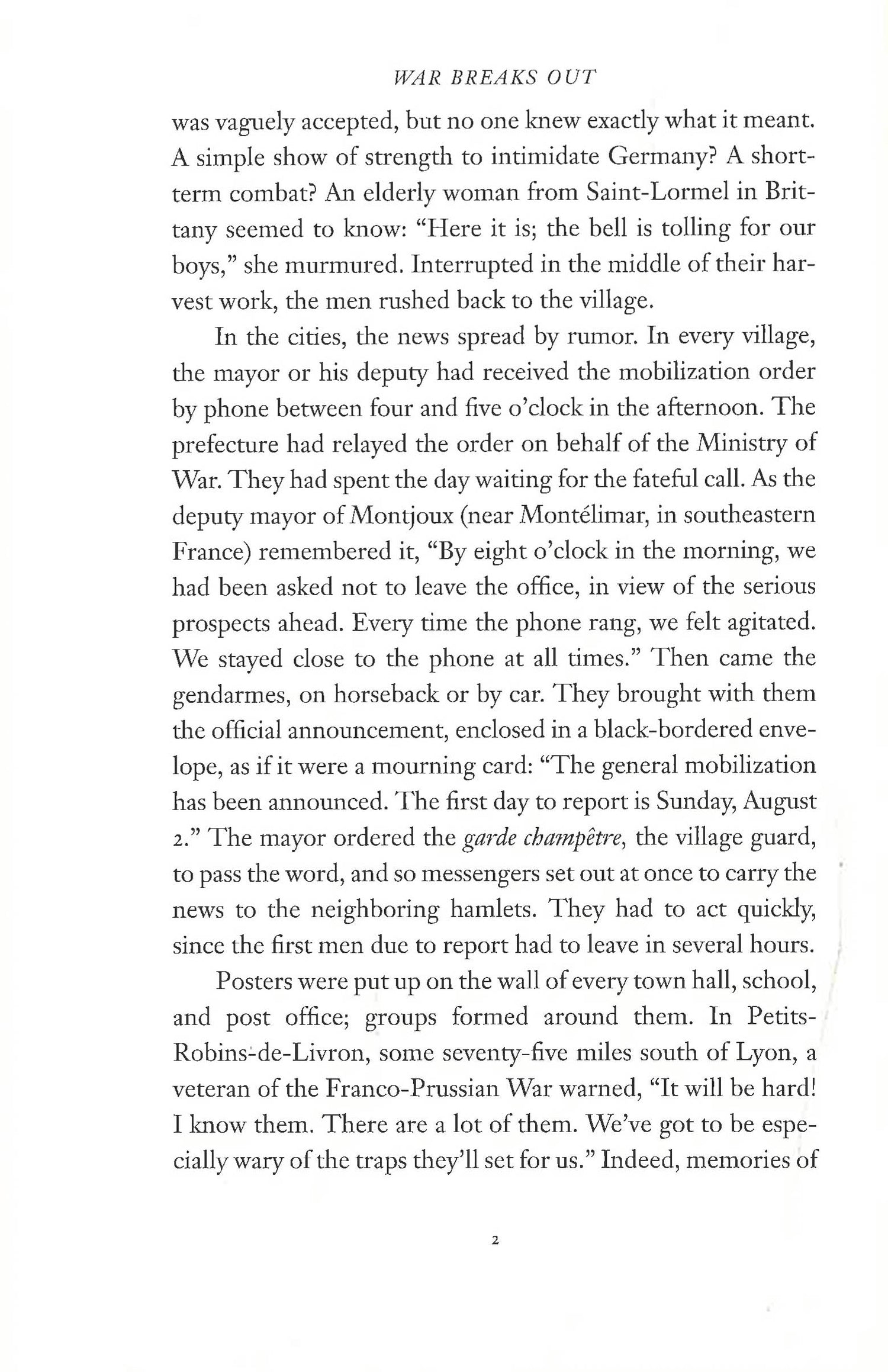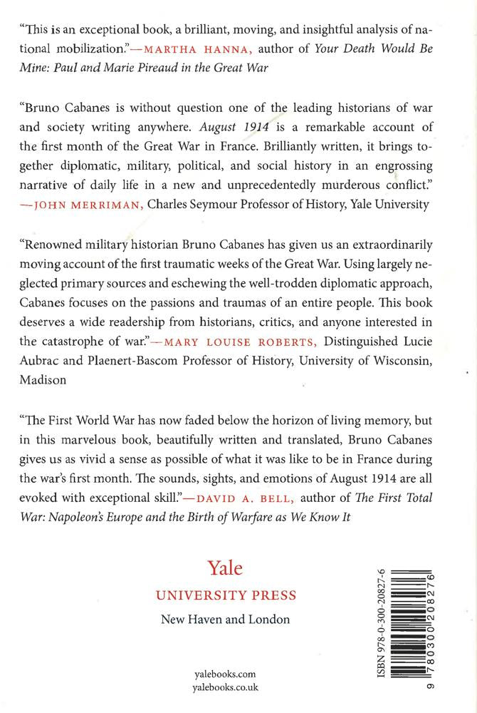A haunting portrait of France at war On August 1, 1914, war erupted into the lives of millions of families across France. Most people thought the conflict would last just a few weeks. Yet before the month was out, twenty-seven thousand French soldiers died on the single day of August 22 alone-the worst catastrophe in French military history. Refugees streamed into France as the German army advanced, spreading rumors that amplified still more the ordeal of war. Citizens of enemy countries who were living in France were viciously scapegoated. Drawing from diaries, personal correspondence, police reports, and government archives, Bruno Cabanes renders an intimate, narrative-driven study of the first weeks of World War I in France. Told from the perspective of ordinary women and men caught in the flood of mobilization, this revealing book deepens our understanding of the traumatic impact of war on soldiers and civilians alike. August 1914 was a finalist for a prestigious French book award, the Prix Femina for nonfiction, in 2014.
