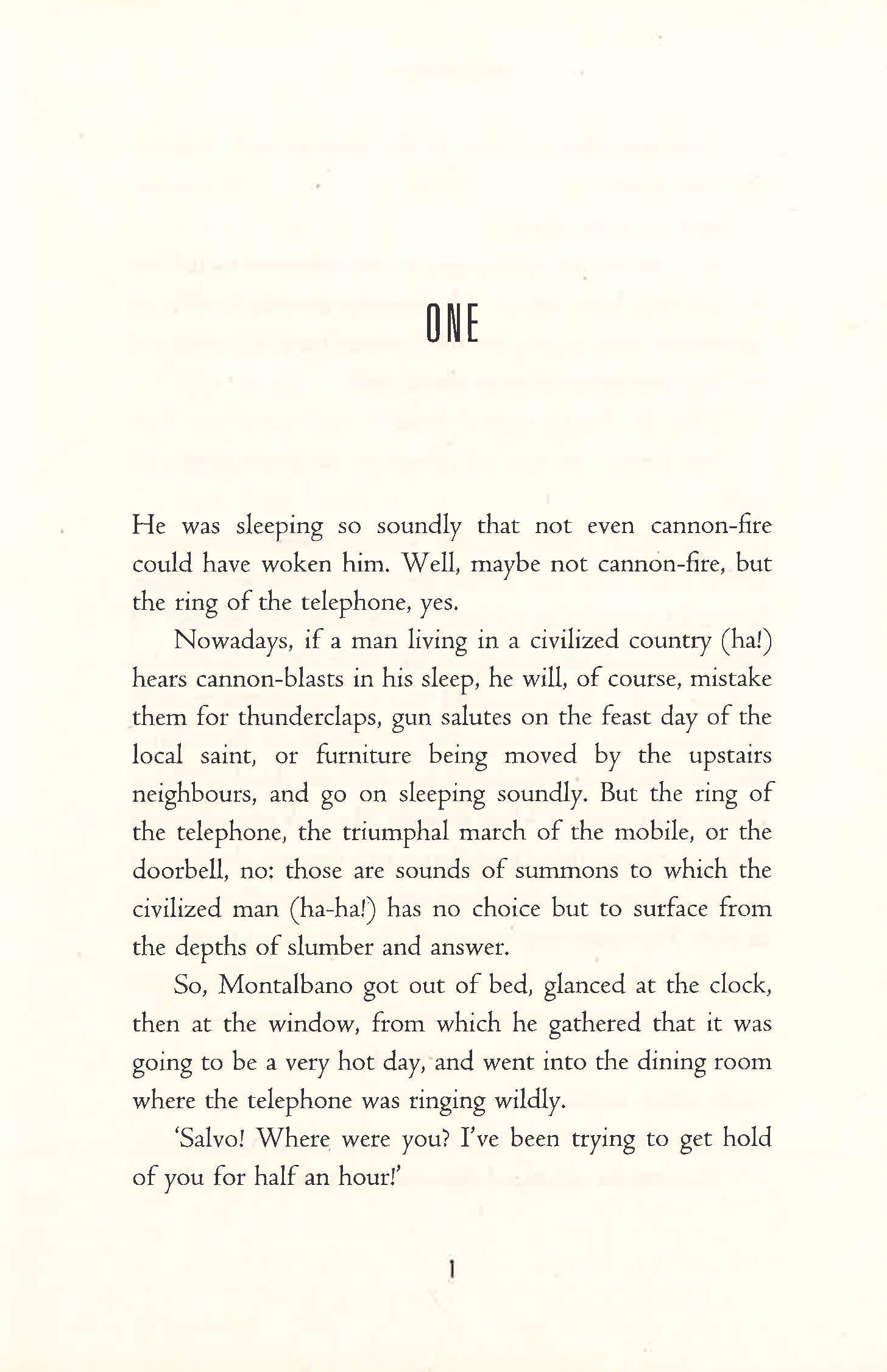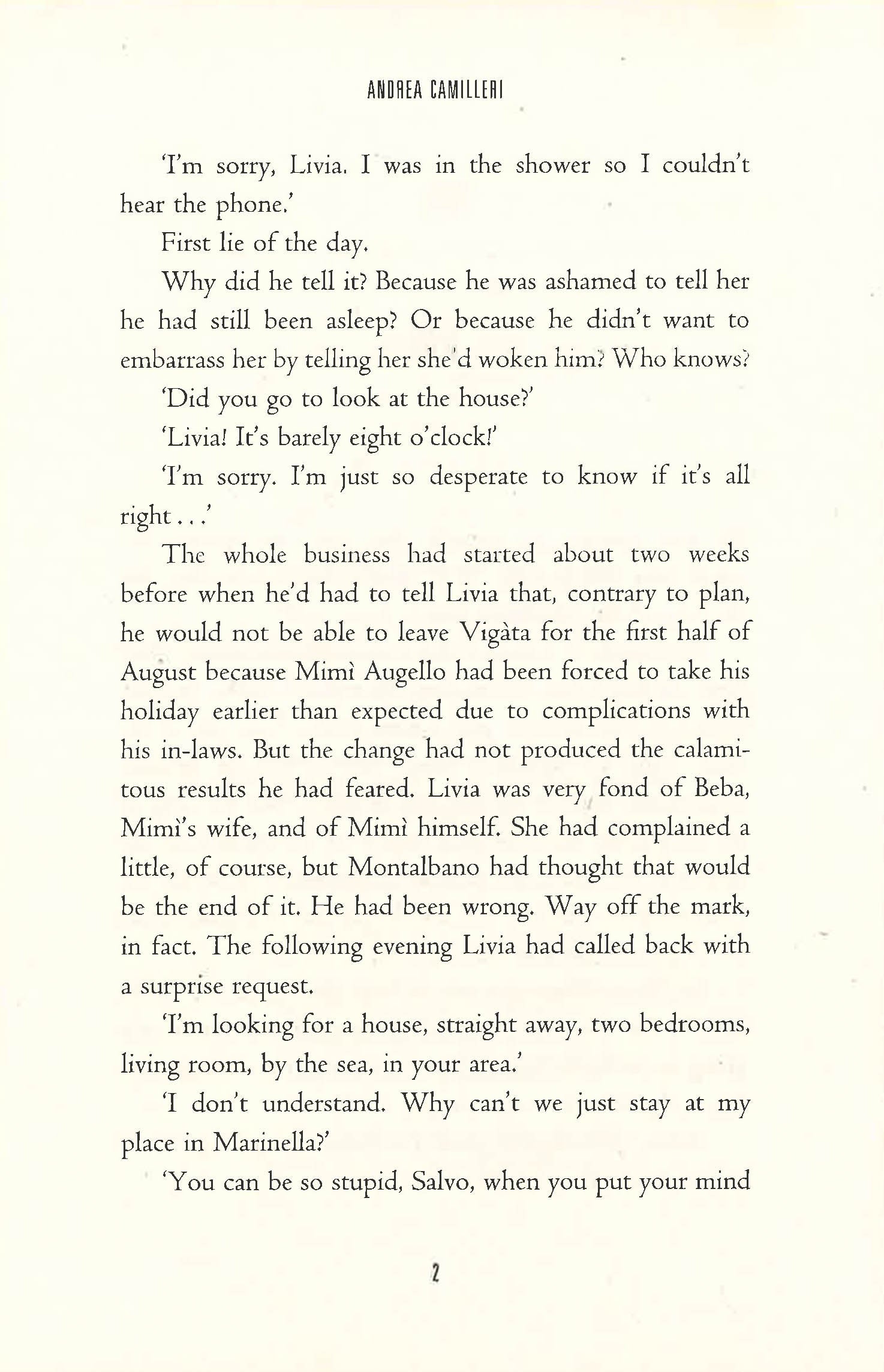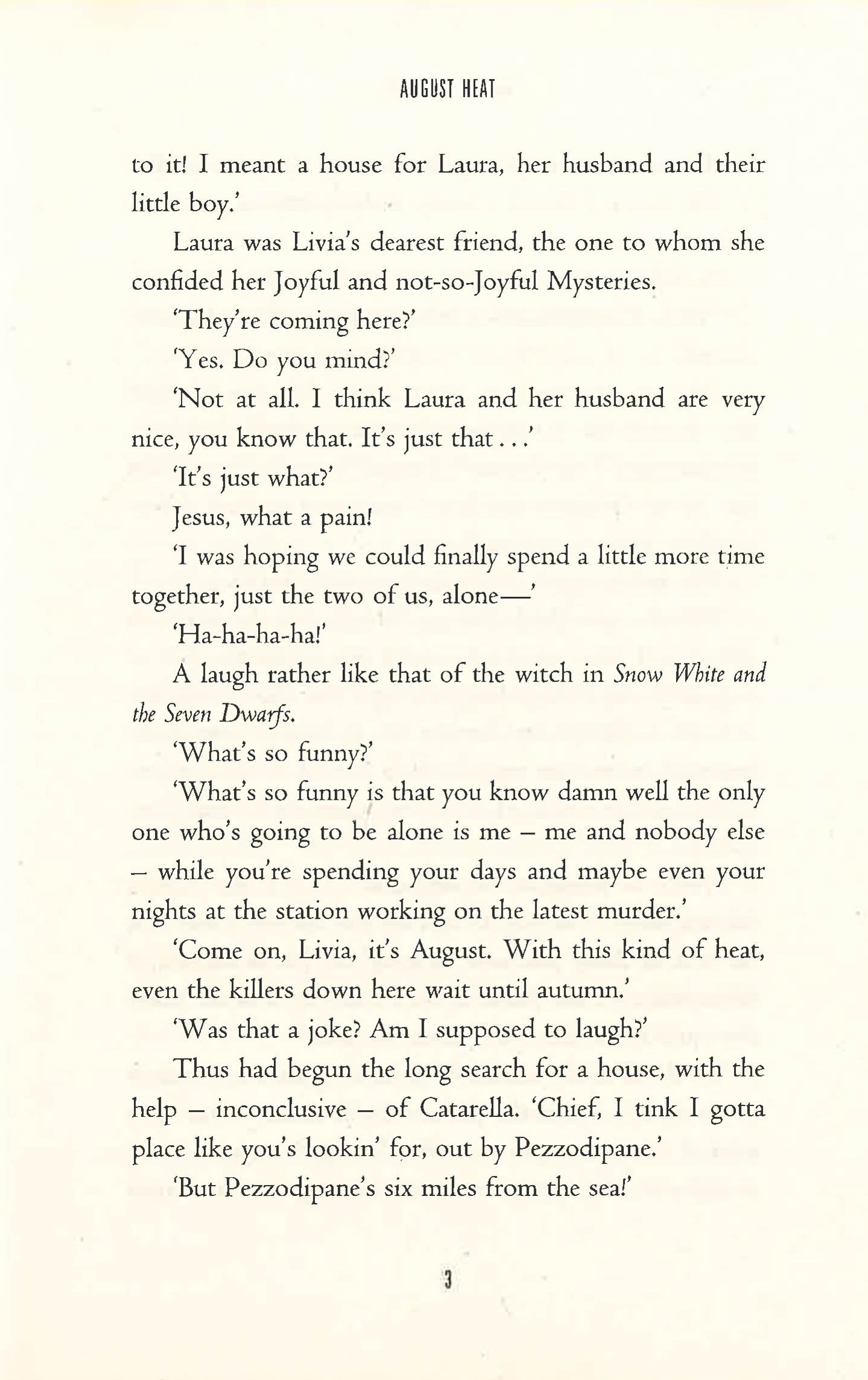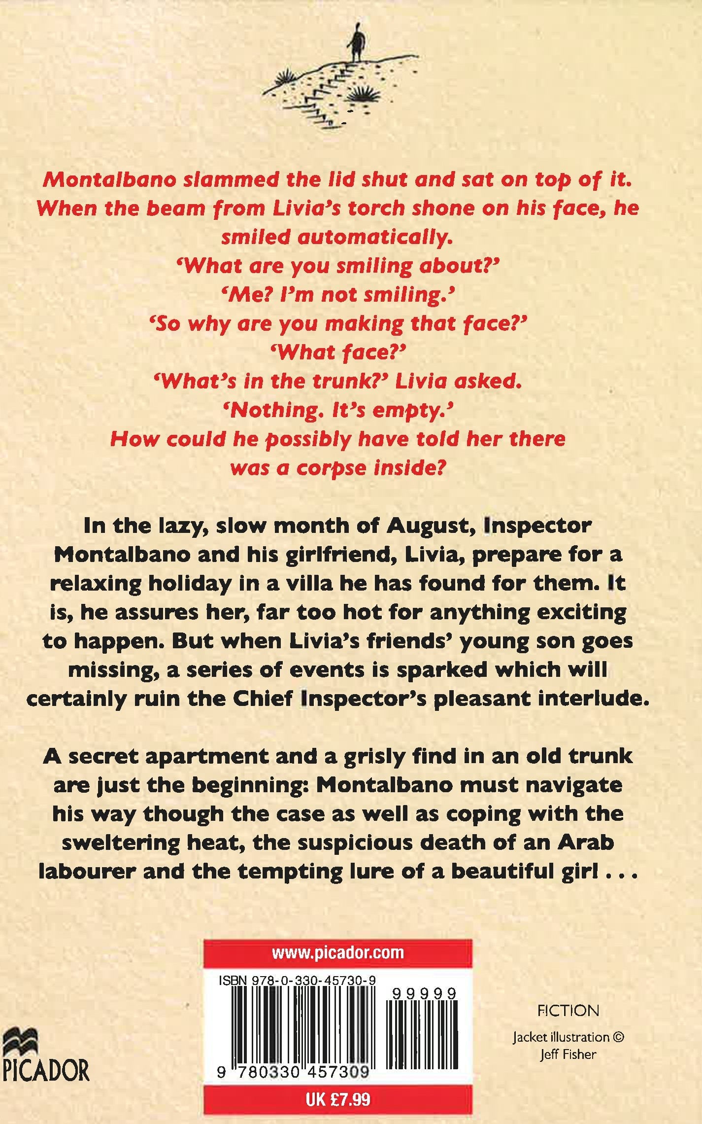 The lazy, slow month of August at the height of the Sicilian summer is, Inspector Montalbano assures his girlfriend Livia as they prepare for a relaxing holiday in a villa he has found for them, far too hot for any murders to be committed. But when Livia's friends' young son goes missing, a chain of events is sparked which will certainly ruin the Chief Inspector's pleasant interlude.