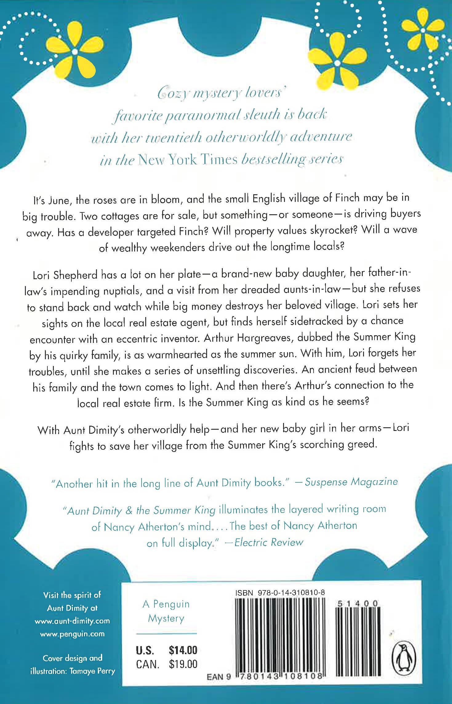 Cozy mystery lovers? favorite paranormal sleuth is back with her twentieth otherworldly adventure in the New York Times?bestselling series It?s June, the roses are in bloom, and the small English village of Finch may be in big trouble. Two cottages are for sale, but something?or someone?is driving buyers away. Has a developer targeted Finch? Will property values skyrocket? Will a wave of wealthy weekenders drive out the longtime locals? Lori Shepherd has a lot on her plate?a brand-new baby daughter, her father-in-law?s impending nuptials, and a visit from her dreaded aunts-in-law?but she refuses to stand back and watch while big money destroys her beloved village. Lori sets her sights on the local real estate agent, but finds herself sidetracked by a chance encounter with an eccentric inventor. Arthur Hargreaves, dubbed the Summer King by his quirky family, is as warmhearted as the summer sun. With him, Lori forgets her troubles, until she makes a series of unsettling discoveries. An ancient feud between his family and the town comes to light. And then there?s Arthur?s connection to the local real estate firm. Is the Summer King as kind as he seems? With Aunt Dimity?s otherworldly help?and her new baby girl in her arms?Lori fights to save her village from the Summer King?s scorching greed.*This book may have remainder mark*