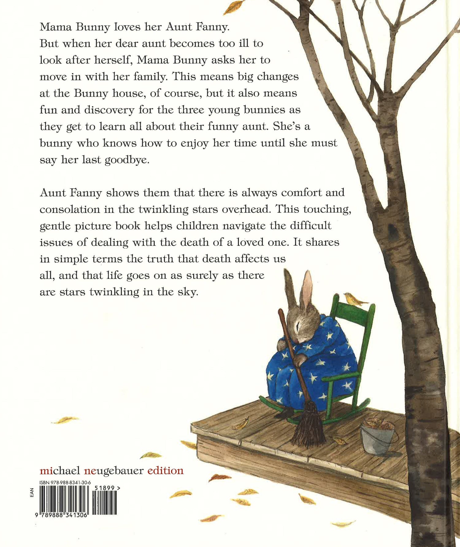 When Aunt Fanny becomes too ill to look after herself, Mama Bunny decides to move her in with her family. This means big changes at the Bunny house, of course, but it also means fun and discovery for the three young bunnies as they get to learn all about their funny aunt. She shows them that there is always comfort and consolation in the twinkling stars overhead. This touching, gentle picture book helps children navigate the difficult issues of dealing with the death of a loved one. It shares in simple terms the truth that death affects us all, and that life goes on as surely as there are stars twinkling in the sky.