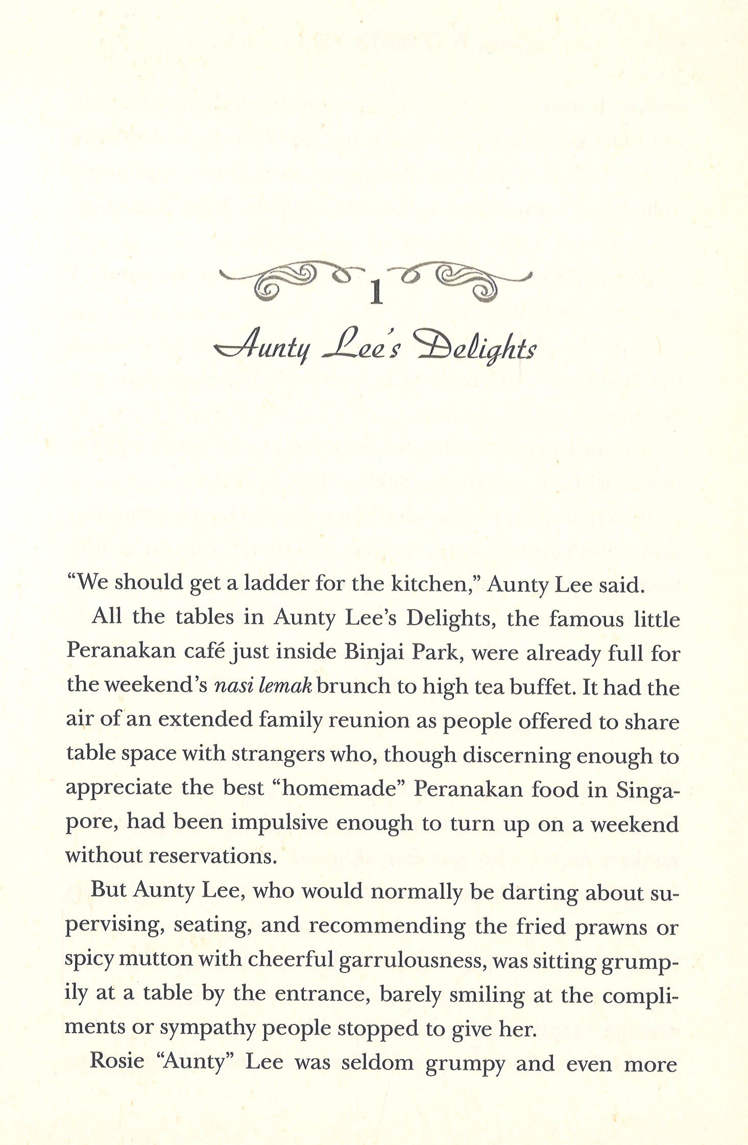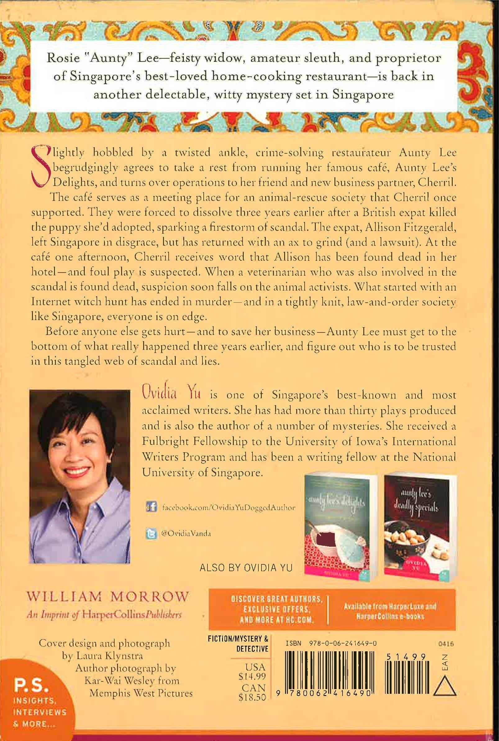Rosie Aunty Lee feisty widow, amateur sleuth and proprietor of Singapore's best-loved home cooking restaurant back in another delectable, witty mystery set in Singapore. Slightly hobbled by a twisted ankle, crime-solving restaurateur Aunty Lee begrudgingly agrees to take a rest from running her famous caf, Aunty Lee's Delights, and turns over operations to her friend and new business partner Cherril. The caf serves as a meeting place for an animal rescue society that Cherril once supported. They were forced to dissolve three years earlier after a British expat killed the puppy she'd adopted, sparking a firestorm of scandal. The expat, Allison Fitzgerald, left Singapore in disgrace, but has returned with an ax to grind (and a lawsuit). At the caf one afternoon, Cherril receives word that Allison has been found dead in her hotel and foul play is suspected. When a veterinarian, who was also involved in the scandal, is found dead, suspicion soon falls on the animal activists. What started with an internet witch hunt has ended in murder and in a tightly knit, law-and-order society like Singapore, everyone is on edge. Before anyone else gets hurt and to save her business Aunty Lee must get to the bottom of what really happened three years earlier, and figure out who is to be trusted in this tangled web of scandal and lies.