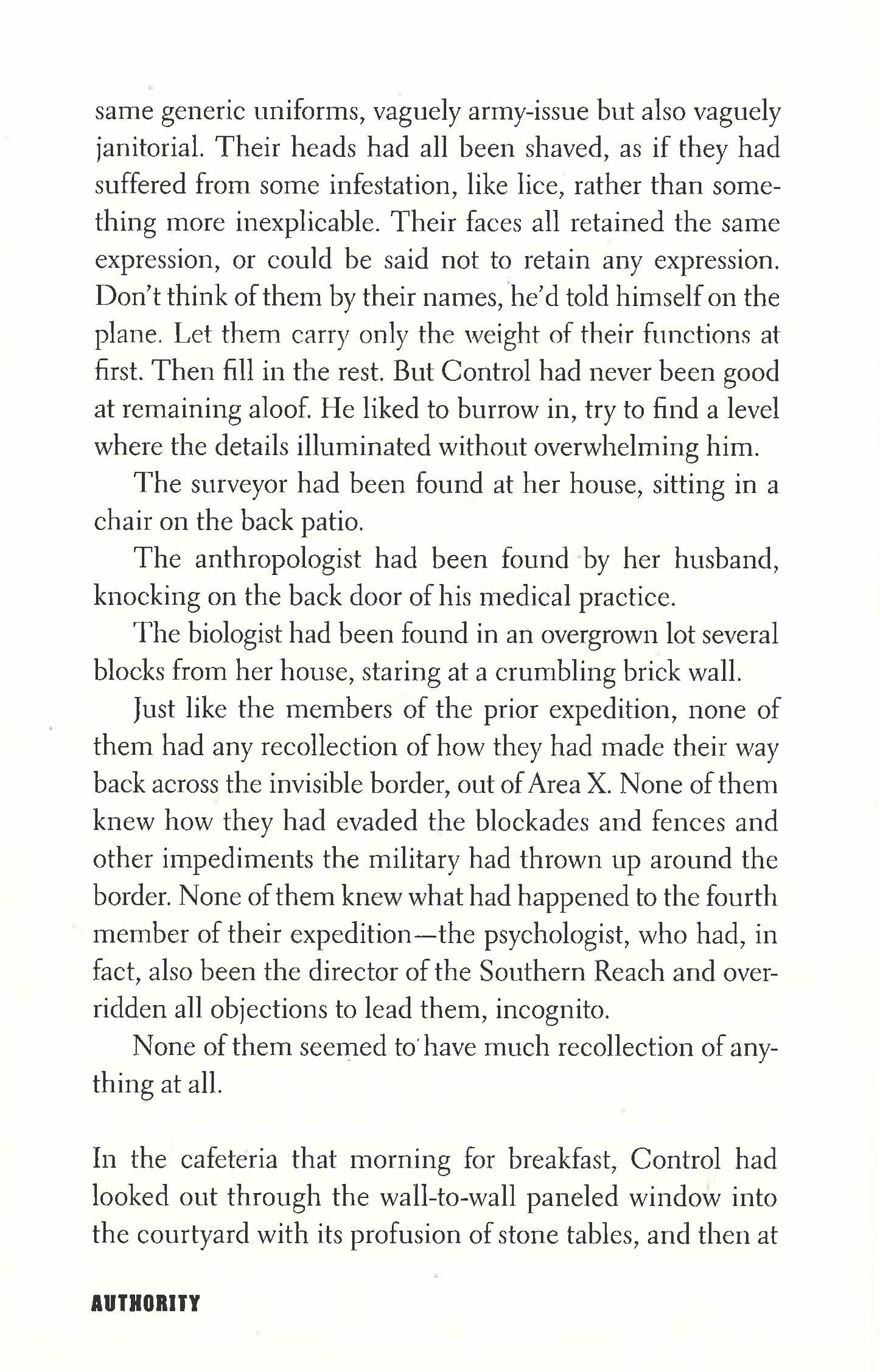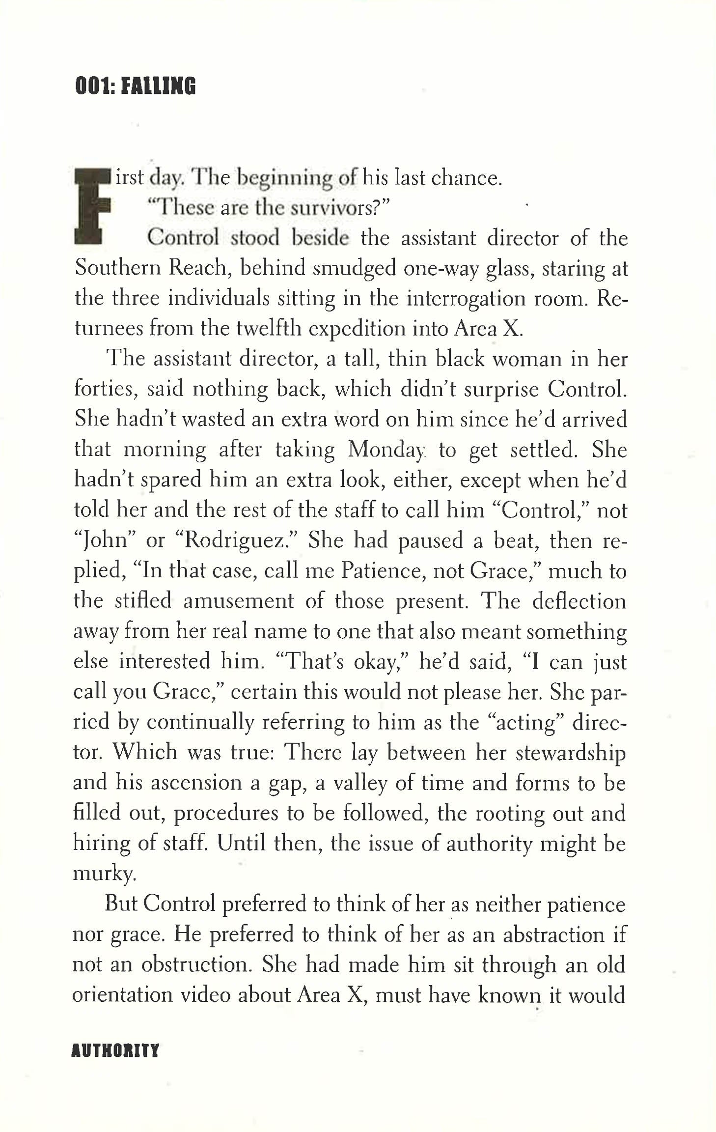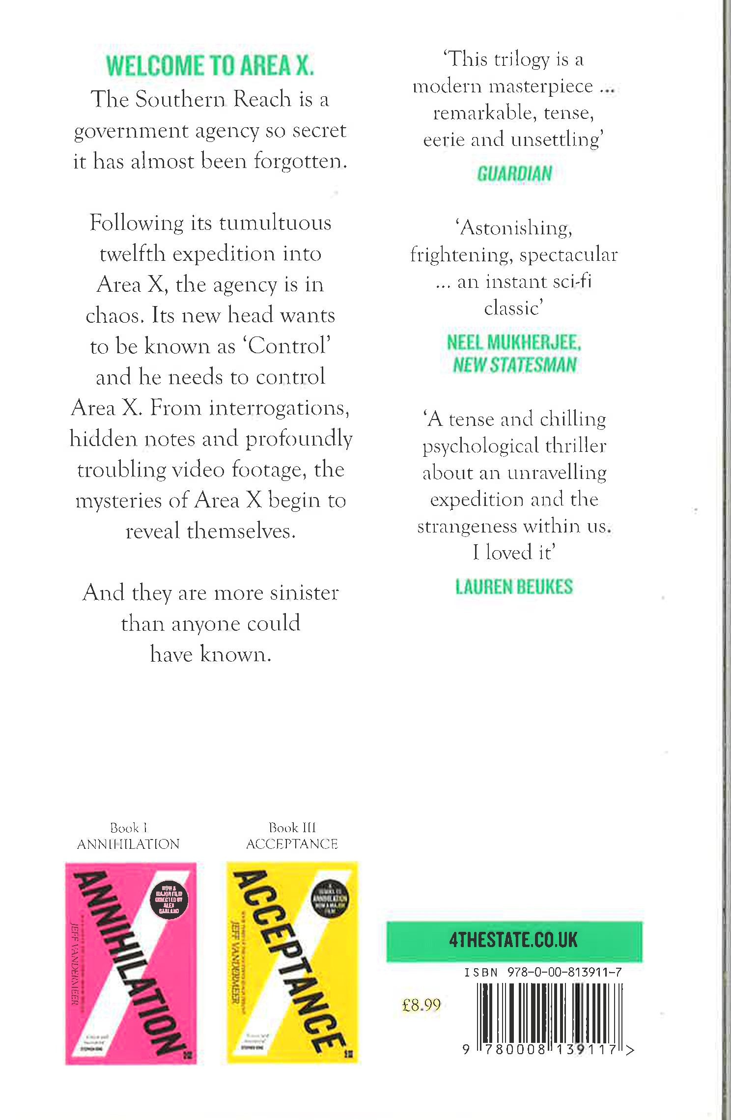 Following the disastrous twelfth expedition chronicled in `Annihilation', the second book of the Southern Reach trilogy introduces John Rodriguez, the new head of the government agency responsible for the safeguarding of Area X. His first day is spent grappling with the fall-out from the last expedition. Area X itself remains a mystery. But, as instructed by a higher authority known only as The Voice, the self-styled Control must battle to `put his house in order'.