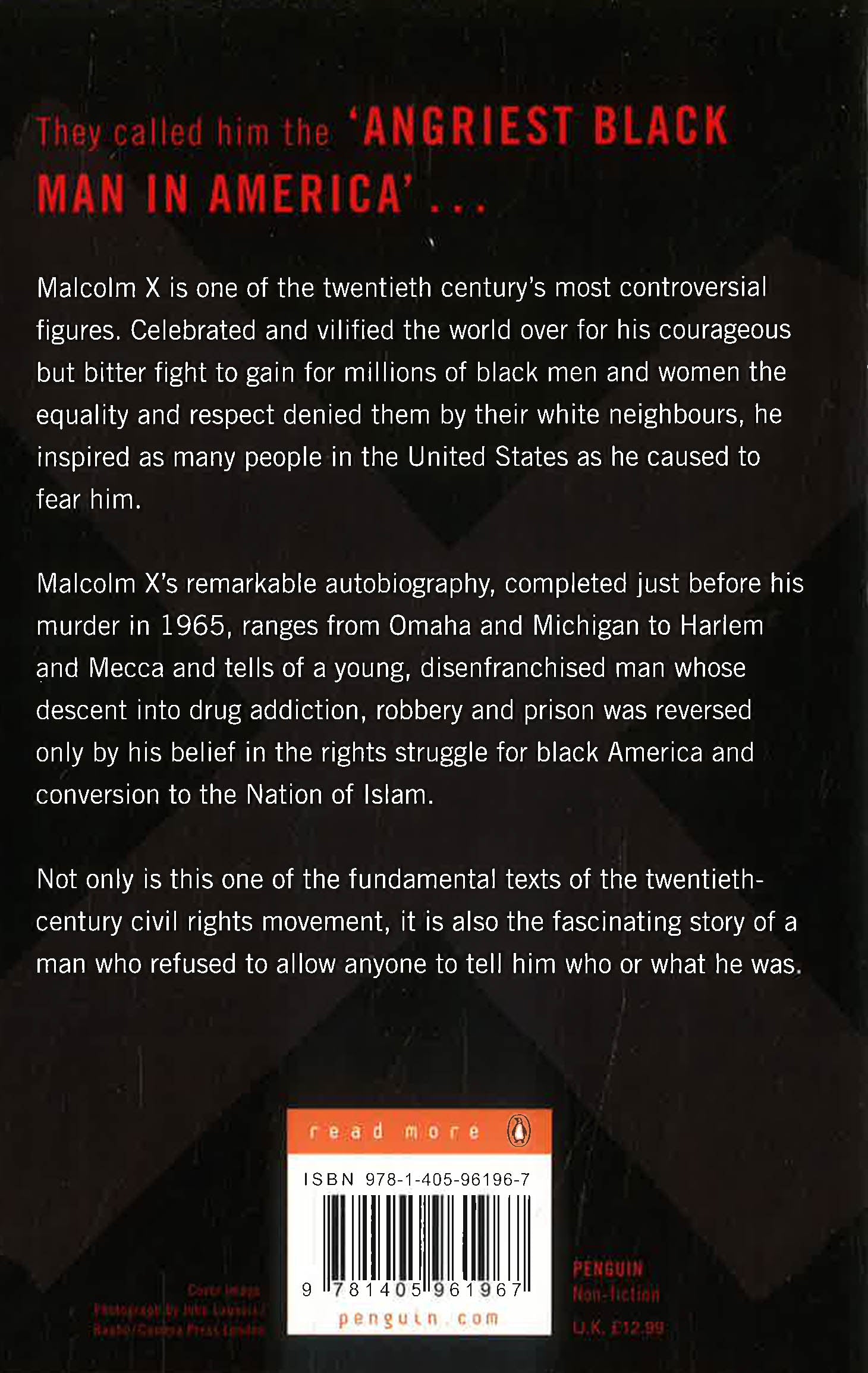 They called him the 'angriest black man in America' . . . Celebrated and vilified the world over for his courageous but bitter fight to gain for millions of black men and women the equality and respect denied them by their white neighbours, Malcolm X inspired as many people in the United States as he caused to fear him. His remarkable autobiography, completed just before his murder in 1965, ranges from Omaha and Michigan to Harlem and Mecca, and tells of a young, disenfranchised man whose descent into drug addition, robbery and prison was only reversed by his belief in the rights struggle for black America, and his conversion to the Nation of Islam. Not only is this an enormously important record of the Civil Rights Movement in America, but also the scintillating story of a man who refused to allow anyone to tell him who or what he was.