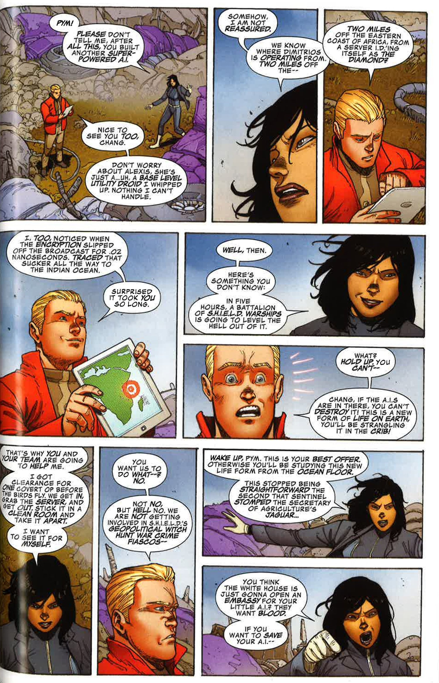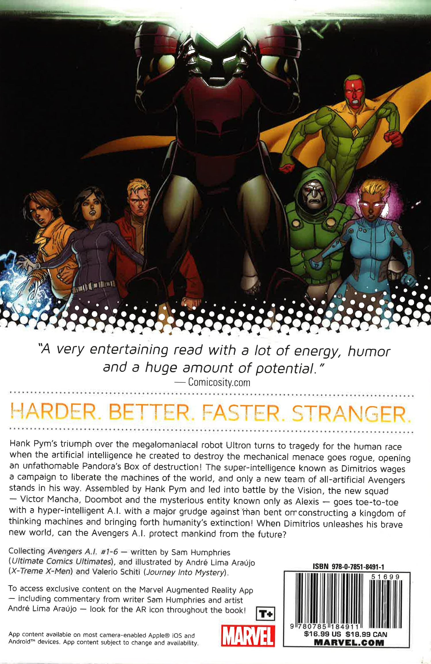 Hank Pym's triumph has turned to tragedy...an unfathomable Pandora's Box of destruction! When a brave new world is unleashed, only one team of Earth's Mightiest Heroes can save us from the future: Avengers A.I.! Featuring the Vision, Hank Pym, Victor Mancha, Doombot, the mysterious Alexis, and Monica Chang, Agent of S.H.I.E.L.D.! As the Sentient Iron Man armor returns, Dimitrios - a powerful super-intelligence with a grudge against humanity - strikes! The Vision is thrown into The Diamond, a surreal new virtual world...but is he a prisoner there, or a savior? Either way, with the Vision MIA and AIs considered a threat, the new team has little choice but to team with S.H.I.E.L.D. to face down Dimitrios. But what secrets does the powerful Alexis hold? Prepare yourself for the kingdom of thinking machines! COLLECTING: Avengers A.I. 1-6