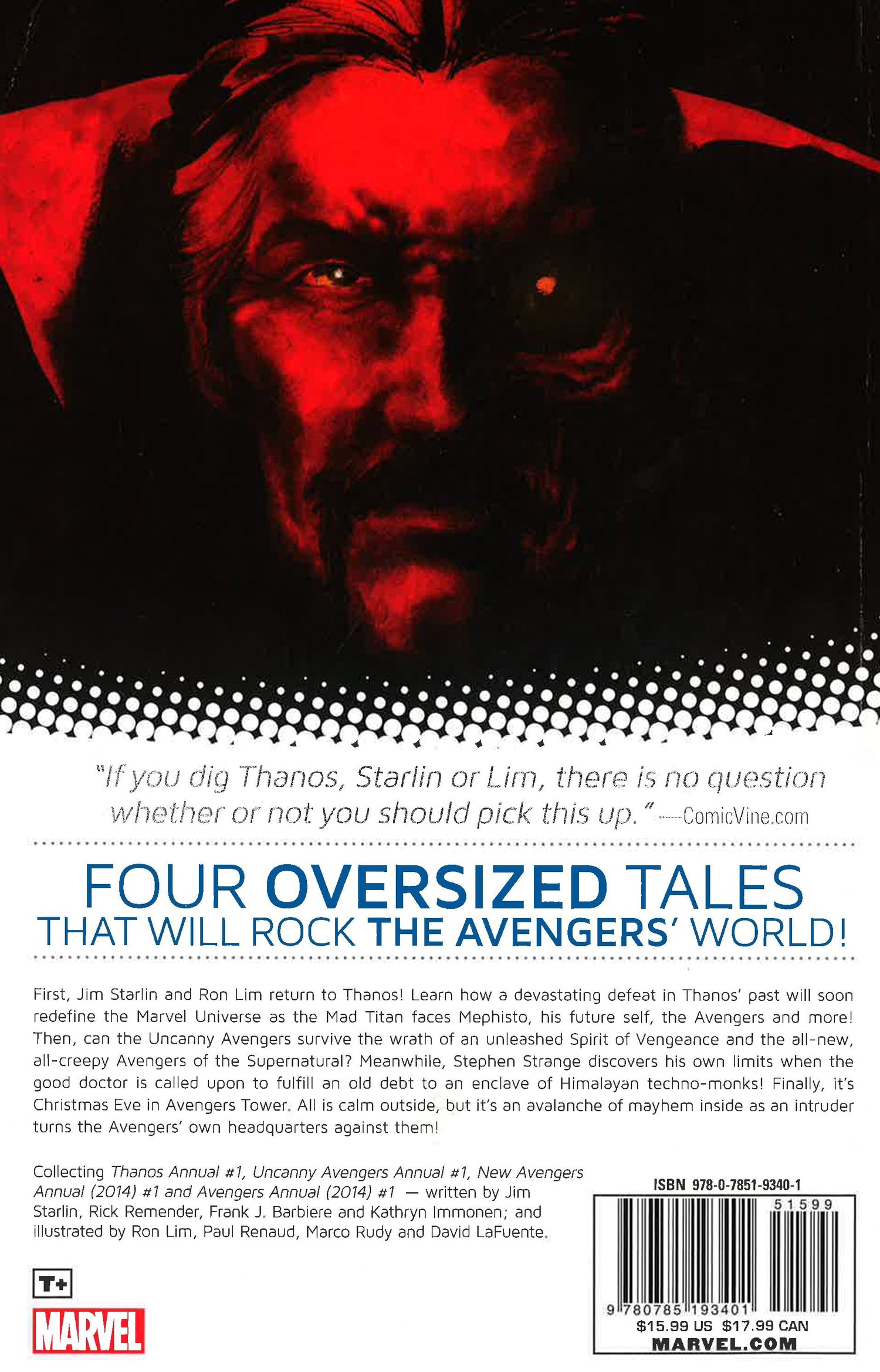 Four oversized tales that will rock the Avengers' world! First, Jim Starlin and Ron Lim return to Thanos! Learn how a devastating defeat in Thanos' past will soon redefine the Marvel Universe, as the Mad Titan faces Mephisto, his future self, the Avengers and more! Then, can the Uncanny Avengers survive the wrath of an unleashed Spirit of Vengeance, and the all-new, all-creepy Avengers of the Supernatural? Meanwhile, when Doctor Strange is called upon to fulfill an old debt to an enclave of Himalayan technomonks, even the good doctor may be beyond his limits!