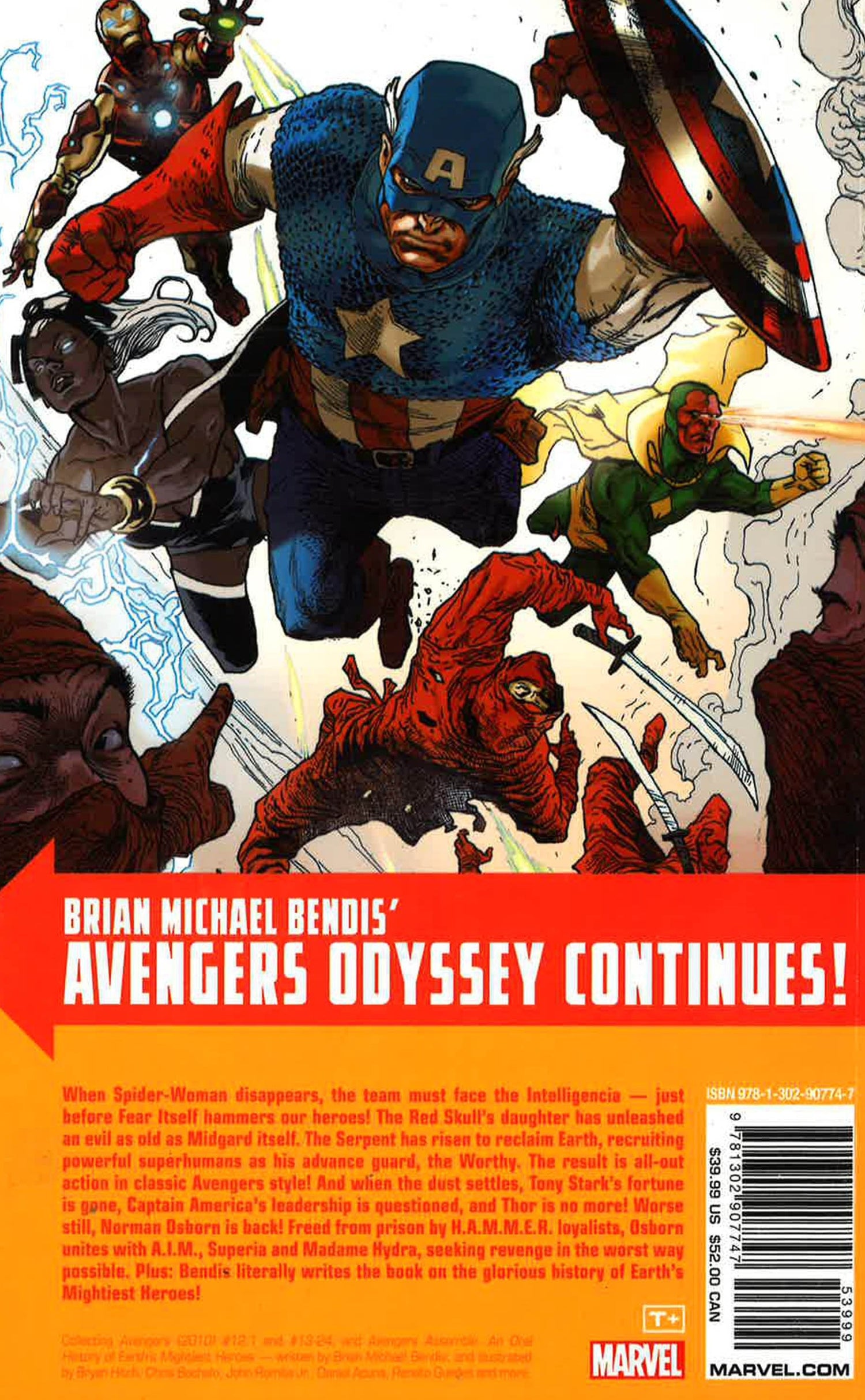 Brian Michael Bendis' Avengers odyssey continues! When Spider-Woman disappears, the team must face the Intelligencia - just before Fear Itself hammers our heroes! The Red Skull's daughter has unleashed an evil as old as Midgard itself. The Serpent has risen to reclaim Earth, recruiting powerful superhumans as his advance guard, the Worthy. The result is all-out action in classic Avengers style! And when the dust settles, Tony Stark's fortune is gone, Captain America's leadership is questioned and Thor is no more! Worse still, Norman Osborn is back! Freed from prison by his H.A.M.M.E.R. loyalists, Osborn unites with A.I.M., Superia and Madame Hydra, seeking revenge in the worst way possible. Plus: Bendis literally writes the book on the glorious history of Earth's Mightiest Heroes! COLLECTING: AVENGERS (2010) 12.1, 13-24; AVENGERS ASSEMBLE: AN ORAL HISTORY OF EARTH'S MIGHTIEST HEROES