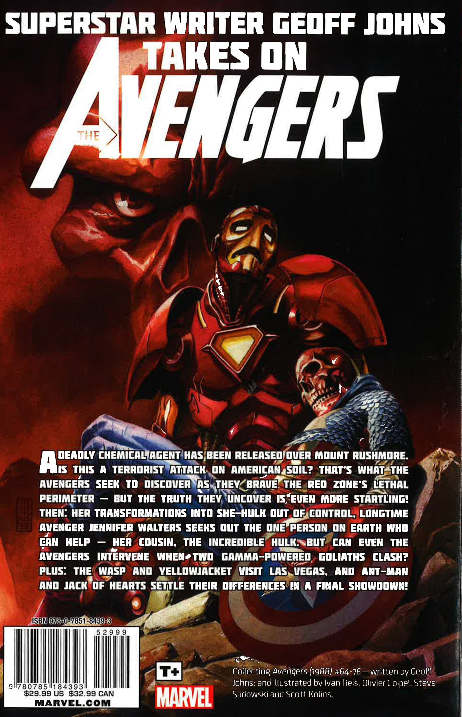 Superstar writer Geoff Johns takes on the Avengers! A deadly chemical agent has been released over Mount Rushmore. Is this a terrorist attack on American soil? That's what the Avengers seek to discover as they brave the Red Zone's lethal perimeter - but the truth they uncover is even more startling! Then: her transformations into She-Hulk out of control, longtime Avenger Jennifer Walters seeks out the one person on Earth who can help: her cousin, the incredible Hulk. But can even the Avengers intervene when two gamma-powered goliaths clash? COLLECTING: Avengers (1998)