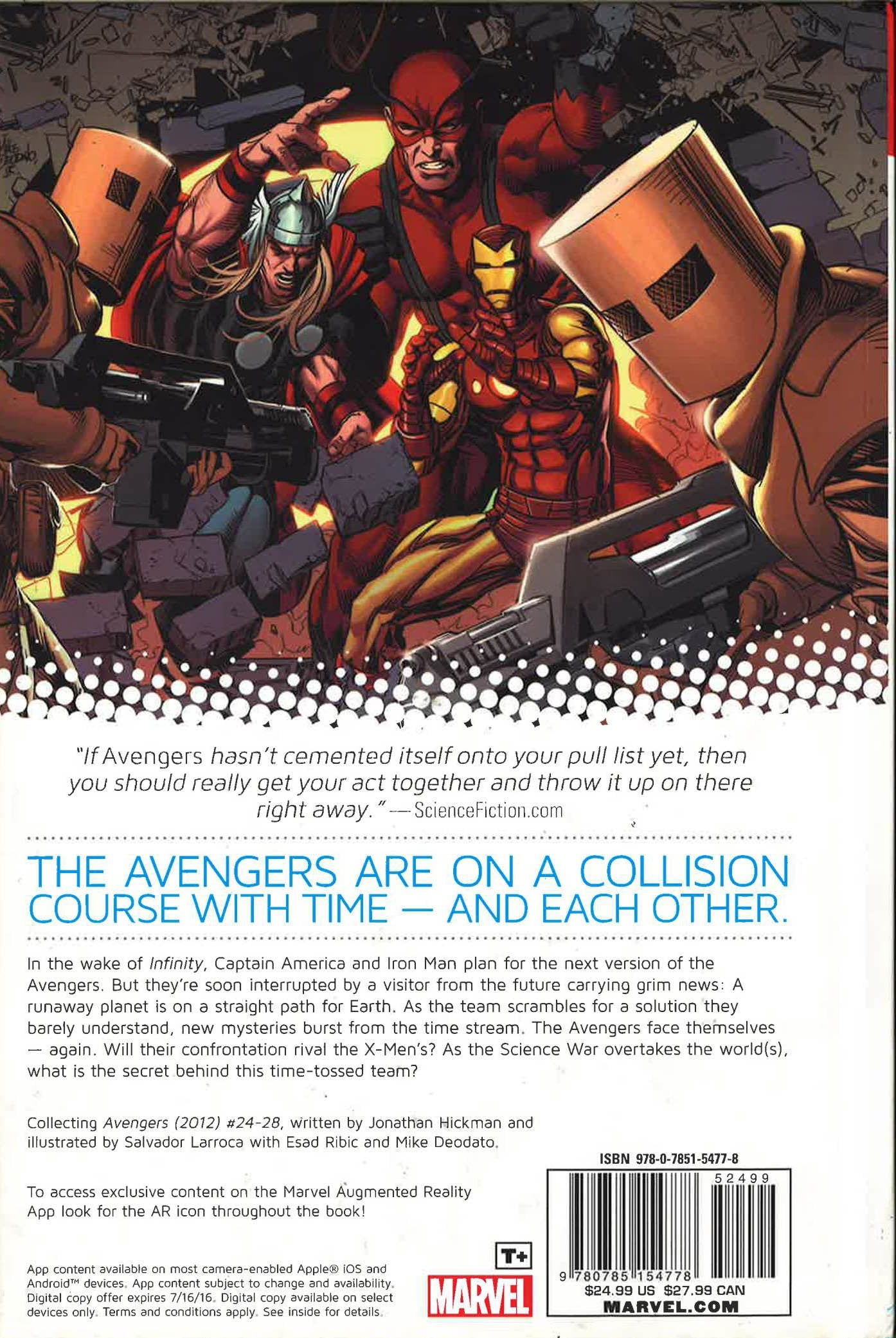 In the wake of the Infinity event, Captain America and Iron Man plan for the next version of the Avengers. But they soon discover that a runaway planet is on a collision course with Earth! Can a visitor from the future help save the day? We've been good up till now, but - this issue, an Avenger dies! Then: it worked for the X-Men. Would we be so crass as to do it again? Yes, yes we would! It's a blast from the past as Marvel introduces the All-New Avengers! But as the Science War overtakes the world(s), what is the secret behind this time-tossed team? When the answers are revealed, you'll wish they remained hidden! The collision of the Avengers and the New Avengers is imminent! COLLECTING: AVENGERS 24-28