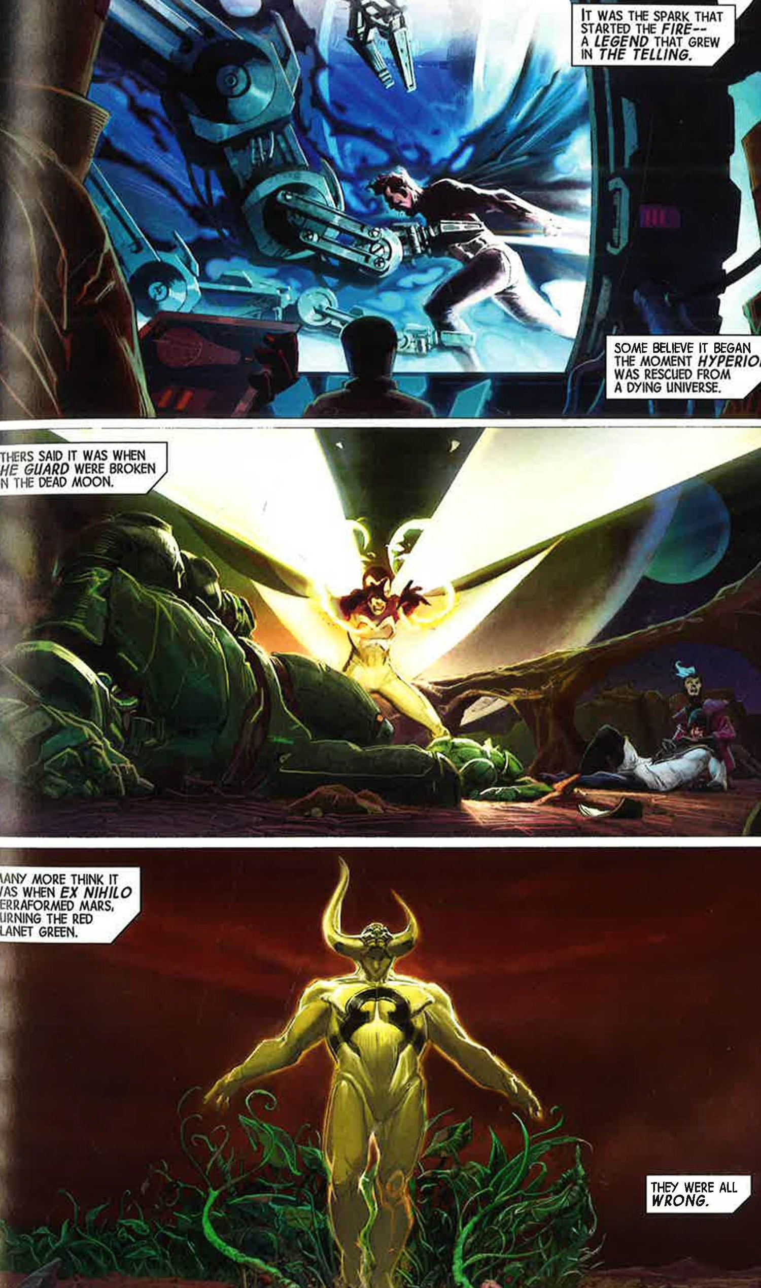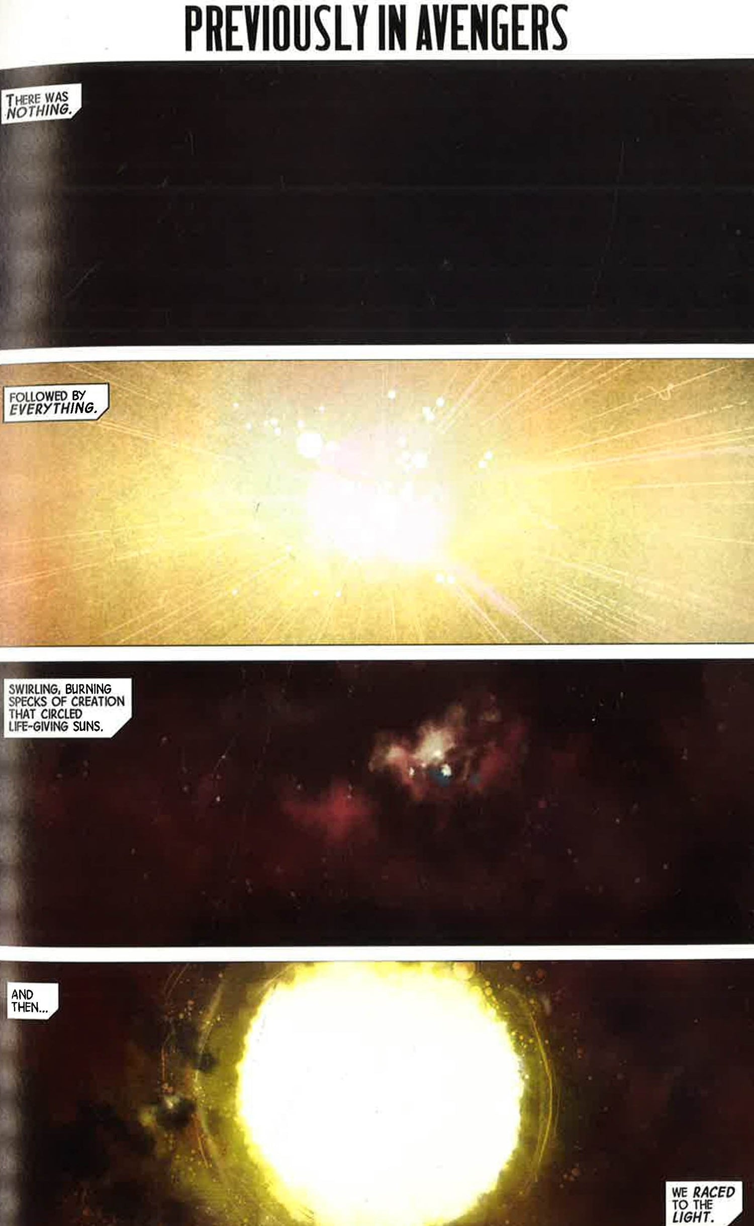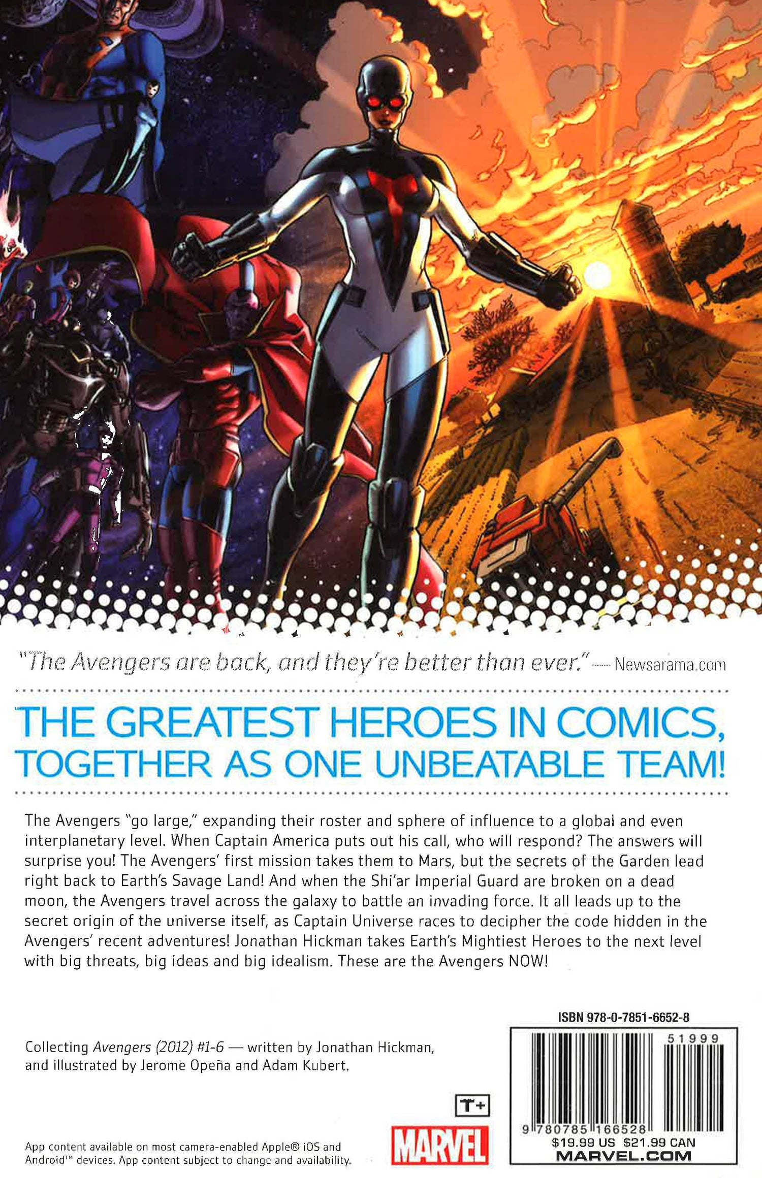 The greatest heroes in comics, together as one unbeatable team! The Avengers "go large," expanding their roster and sphere of influence to a global and even interplanetary level. When Captain America puts out his call, who will respond? The answers will surprise you! The Avengers' first mission takes them to Mars, but the secrets of the Garden lead right back to Earth's Savage Land! And when the Shi'ar Imperial Guard are broken on a dead moon, the Avengers travel across the galaxy to batt le an invading force. It all leads up to the secret origin of the universe itself, as Captain Universe races to decipher the code hidden in the Avengers' recent adventures! Jonathan Hickman takes Earth's Mightiest Heroes to the next level with big threats, big ideas and big idealism.