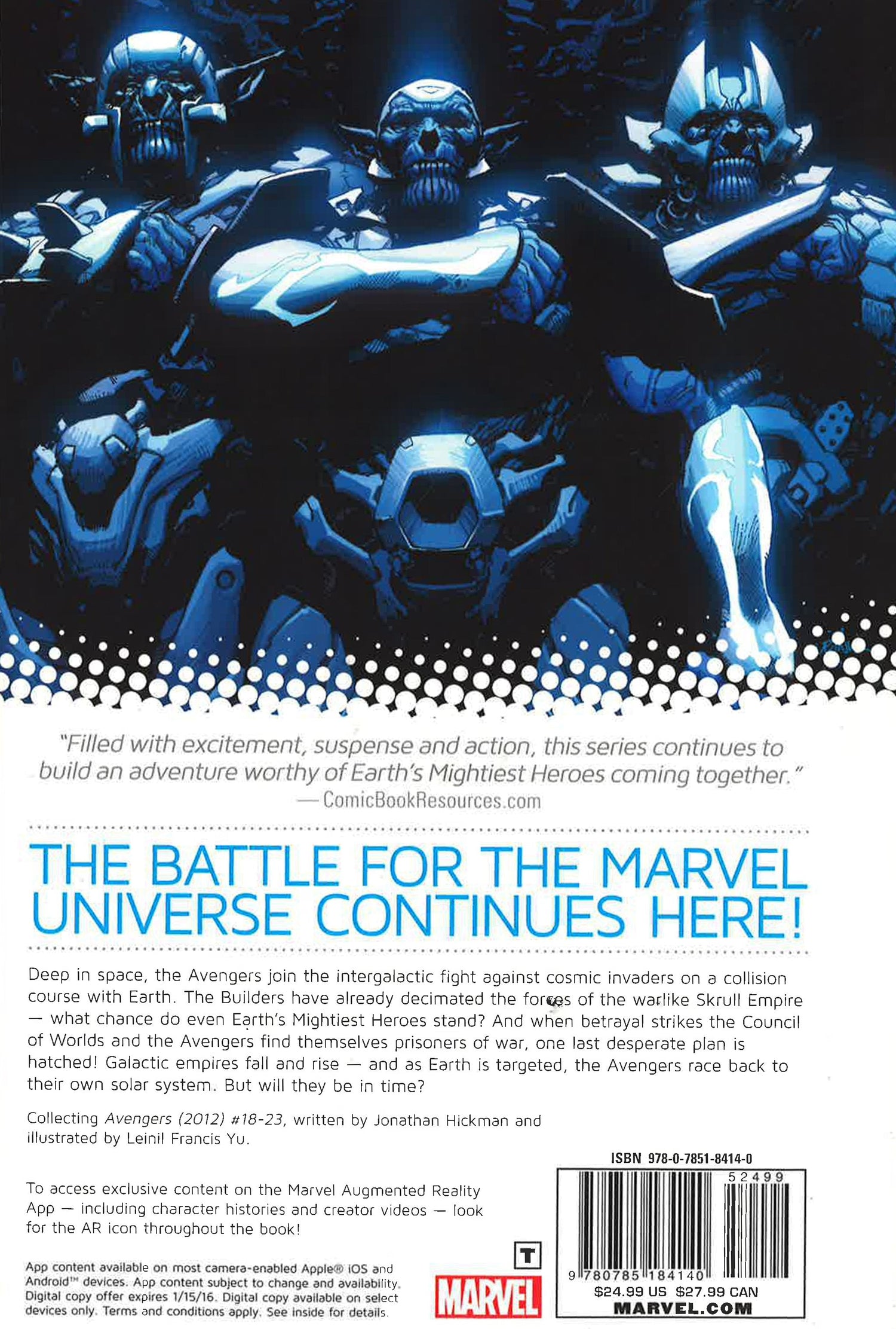 Infinity tie-in! Deep in space, the Avengers join the Council of Worlds as they declare war on their cosmic invaders. As the Skrull Empire is reborn, witness the first encounter with the Builders! And when betrayal strikes the Galactic Council and the Avengers find themselves prisoners of war, one last desperate plan is hatched! The Builders make unexpected overtures, Ex Nihilo re-enters the picture, and the final battle for the Marvel Universe begins. Galactic empires fall and rise, and as Earth is targeted, the Avengers race back to their own solar system - but will they be in time to stop the Black Order from making their move? Or will Thanos' mad plans conquer all life?
