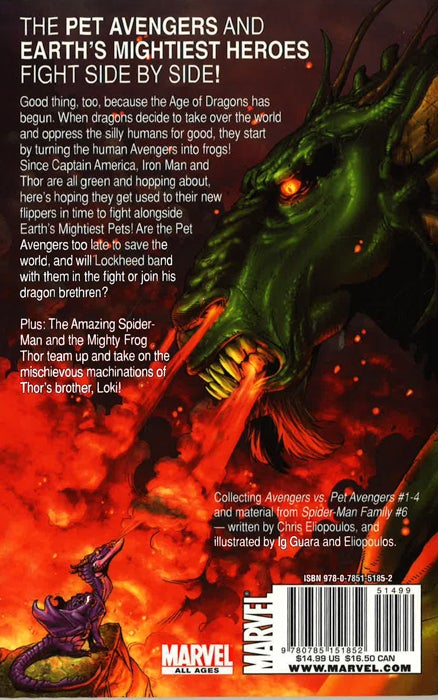 Basic Truth: It's very hard to protect the earth when you've been turned into a frog. The Pet Avengers Return! Good thing, too, cuz dragons have decided that it's time to take over the world and oppress the silly humans once and for all!!! And since Captain America, Iron Man & Thor are all green and hopping about, here's hoping they can get used to their new flippers in time to flight alongside Earth's Mightiest Pets! Plus: Frog-Thor meets Spider-Man!