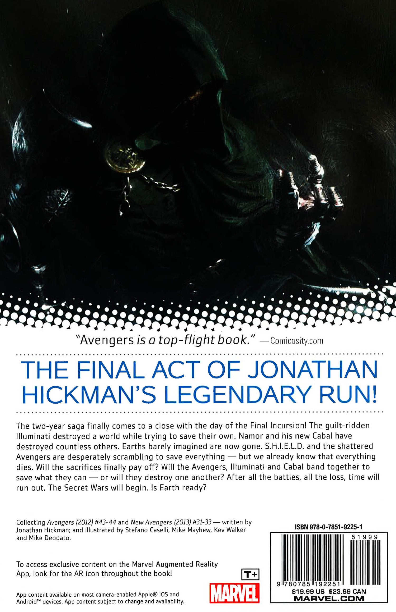 The final act of Jonathan Hickman's legendary run! The two-year saga finally comes to a close with the day of the Final Incursion! The guilt-ridden Illuminati destroyed a world while trying to save their own. Namor and his new Cabal have destroyed countless others. Earths barely imagined are now gone. S.H.I.E.L.D. and the shattered Avengers are desperately scrambling to save everything - but we already know that everything dies. Will the sacrifi ces finally pay off ? Will the Avengers, Illuminati and Cabal band together to save what they can - or will they destroy one another? After all the battles, all the loss, the inevitable is here: time will run out. The Secret Wars will begin. Is Earth ready?