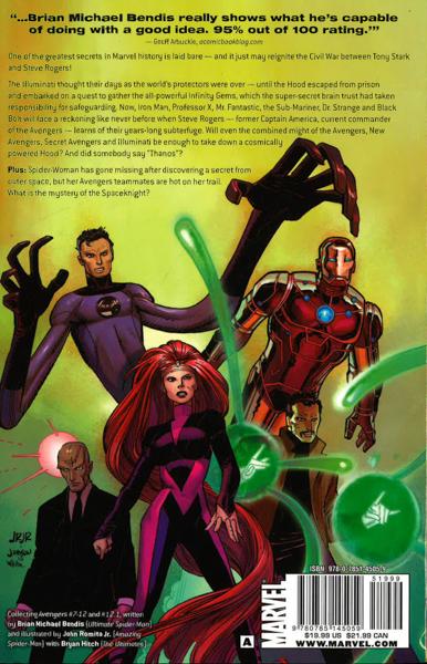 One of the greatest secrets in Marvel history is laid bare--and it just may reignite the Civil War between Tony Stark and Steve Rogers! The Illuminati thought their days as the world's protectors were over--until the Hood escaped from prison and embarked on a quest to gather the all-powerful Infinity Gems, which the super-secret brain trust had taken responsibility for safeguarding. Now, Iron Man, Professor X, Mr. Fantastic, the Sub-Mariner, Dr. Strange and Black Bolt will fact a reckoning like never before when Steve Rogers--former Captain America, current commander of the Avengers--learns of their years-long subterfuge. Will even the combined might of the Avengers, New Avengers, Secret Avengers and Illuminati be enough to take down a cosmically powered Hood? And did somebody say "Thanos"? Plus: Spider-Woman has gone missing after discovering a secret from outer space, but her Avengers teammates are hot on her trail. What is the mystery of the Spaceknight?