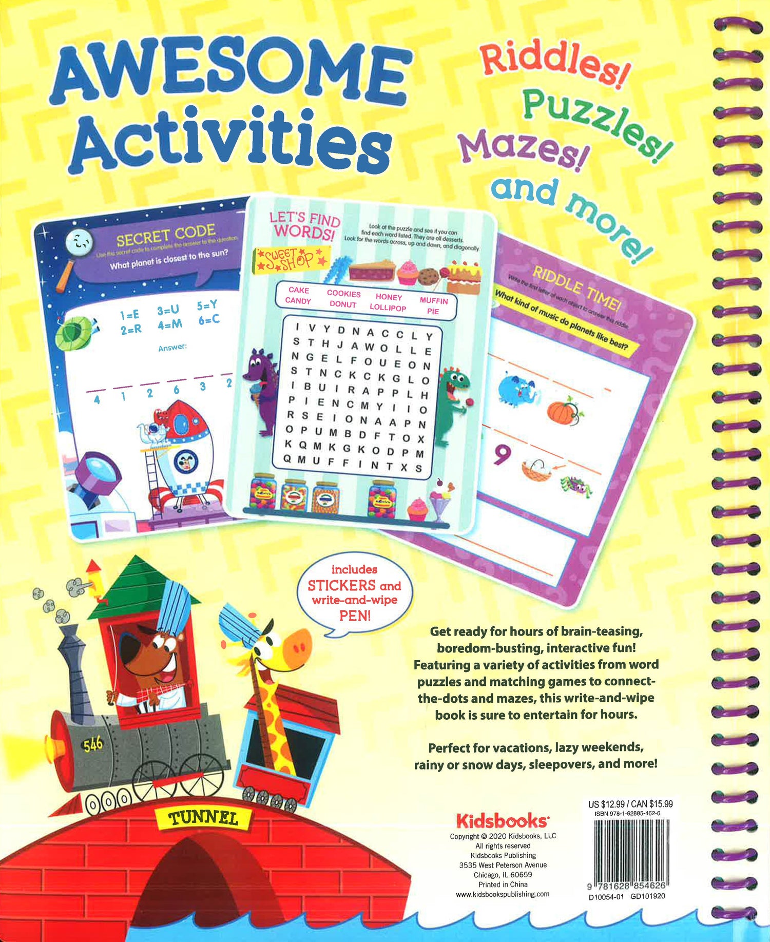 Get ready for hours of brain-teasing, boredom-busting, interactive fun! Featuring a variety of activities from word puzzles and matching games to connect-the-dots and mazes, this write-and-wipe book is sure to entertain for hours. Perfect for vacations, lazy weekends, rainy or snow days, sleepovers, and more! Includes two pages of stickers to use with activities.