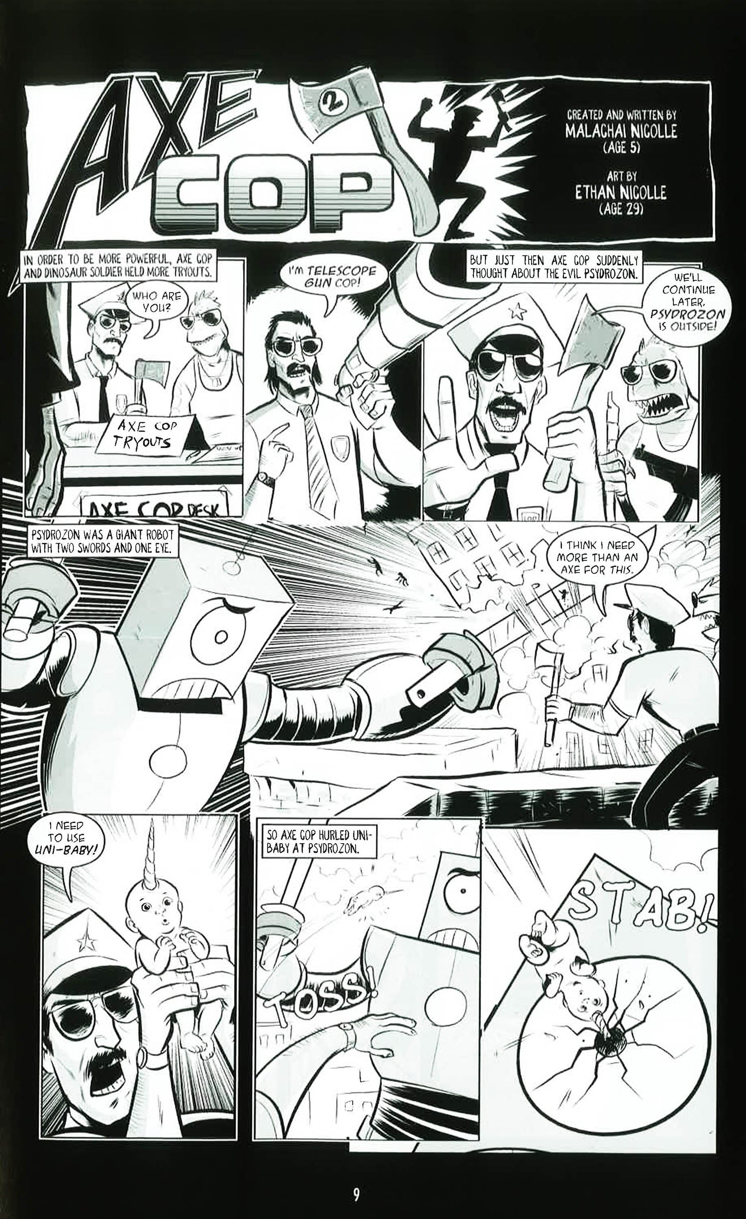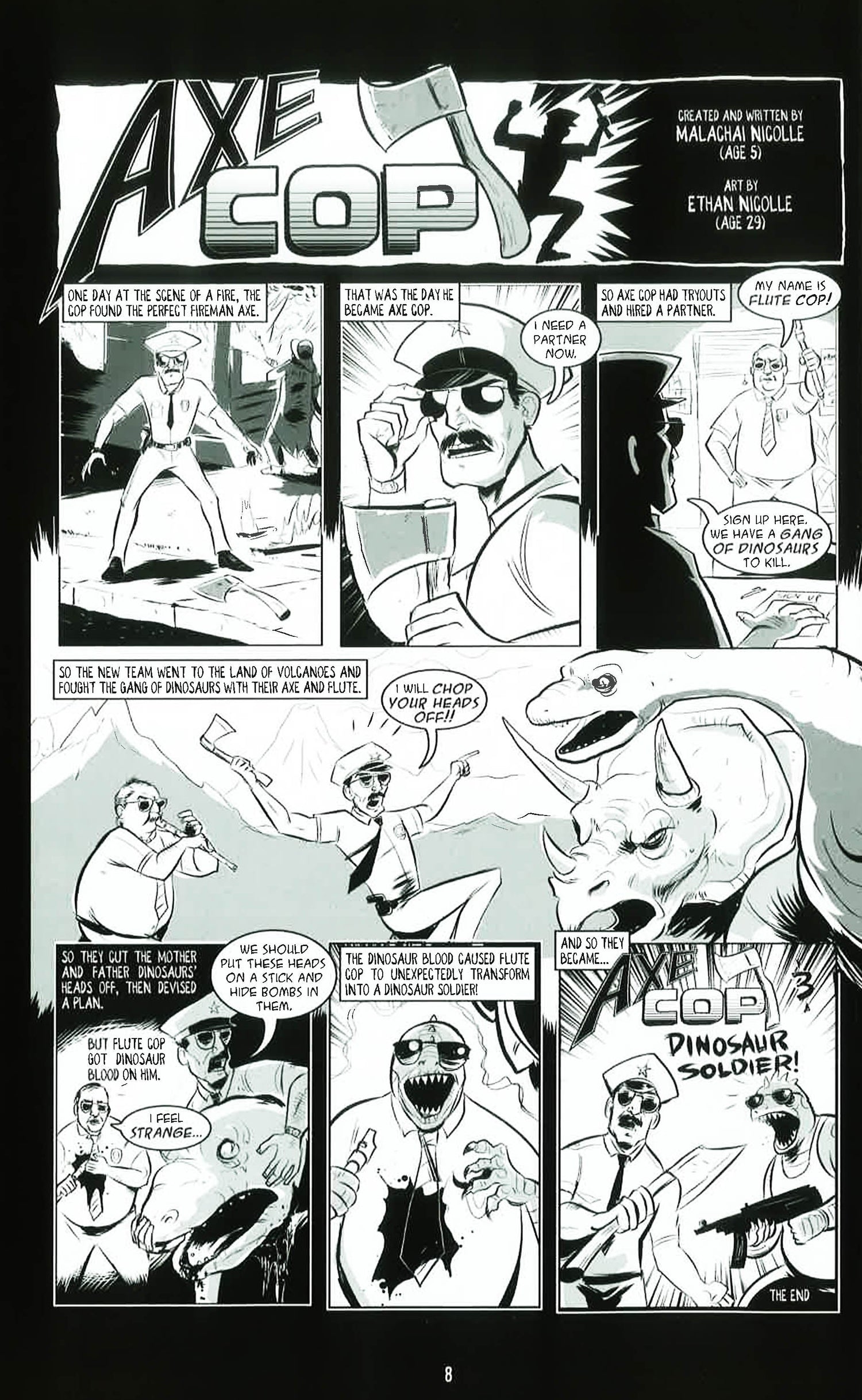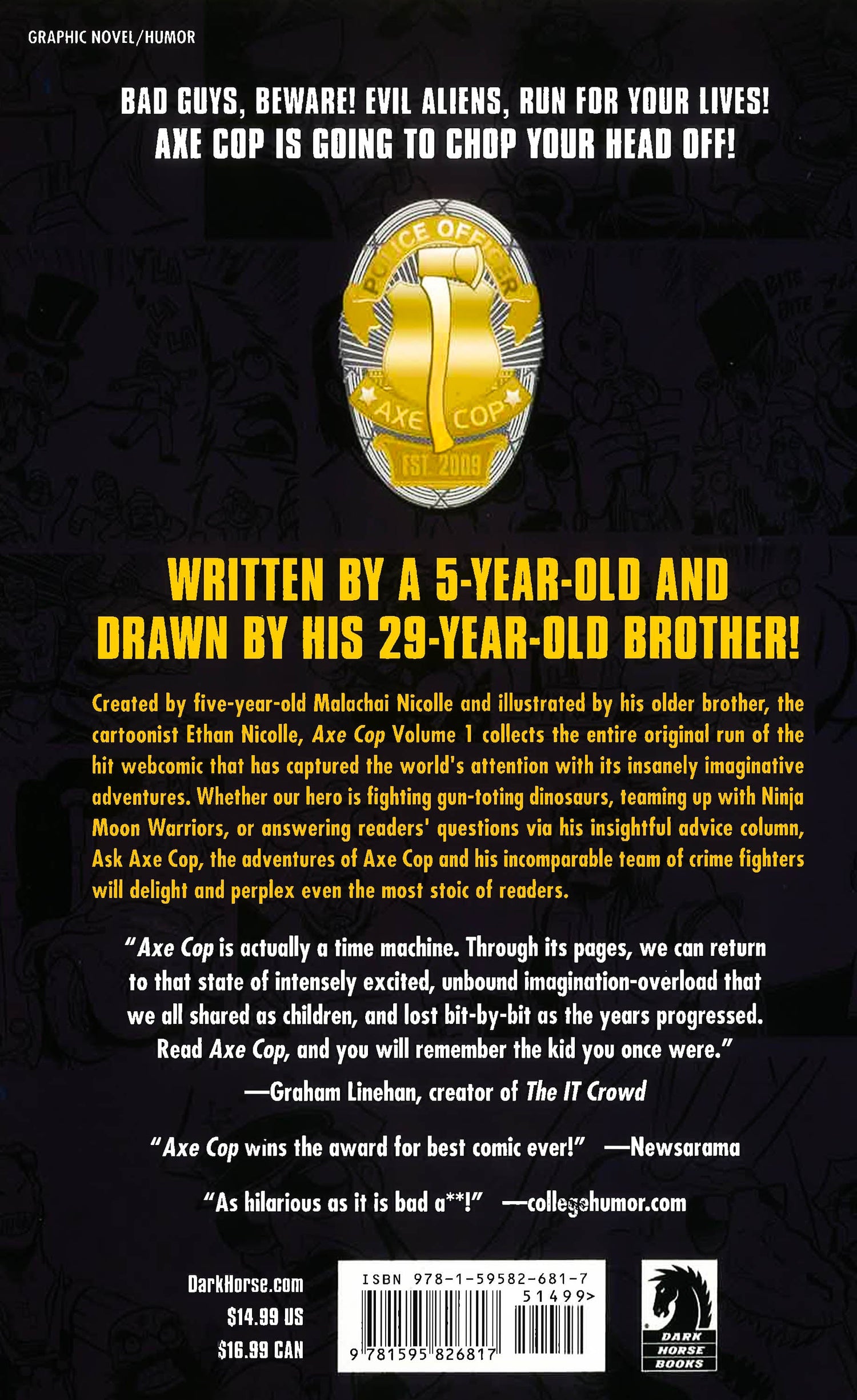 Bad guys, beware! Evil aliens, run for your lives! Axe Cop is here, and he's going to chop your head off! We live in a strange world, and our strange problems call for strange heroes. That's why Axe Cop--along with his partner Flute Cop and their pet T. rex Wexter--is holding tryouts to build the greatest team of heroes ever assembled. Created by five-year-old Malachai Nicolle and illustrated by his older brother, the cartoonist Ethan Nicolle, Axe Cop Volume 1 collects the entire original run of the hit webcomic that has captured the world's attention with its insanely imaginative adventures. Whether he's fighting gun-toting dinosaurs, teaming up with Ninja Moon Warriors, or answering readers' questions via his insightful advice column, "Ask Axe Cop," the adventures of Axe Cop and his incomparable team of crime fighters will delight and perplex even the most stoic of readers. - Axe Cop debuted in January 2010 to glowing reviews from Entertainment Weekly, Wired, and dozens of other newspapers and magazines. - Comics website Newsarama said, "Axe Cop wins the award for best comic ever!"