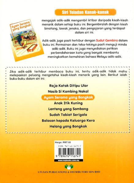 Siri Teladan Kanak-kanak mengajak adik-adik mengambil iktibar daripada kisah-kisah menarik dalam setiap buku ini. Bergembiralah dengan kisah binatang, lawak jenaka, dan pengajaran yang terdapat dalam siri ini. Adik-adik juga pasti terhibur dengan Sudut Gembira dalam buku ini. Permainan dan teka-tekinya pasti menguji minda adik-adik. Buku ini juga menyediakan petikan perbendaharaan kata yang banyak membantu meningkatkan kemahiran bahasa Melayu adik-adik.