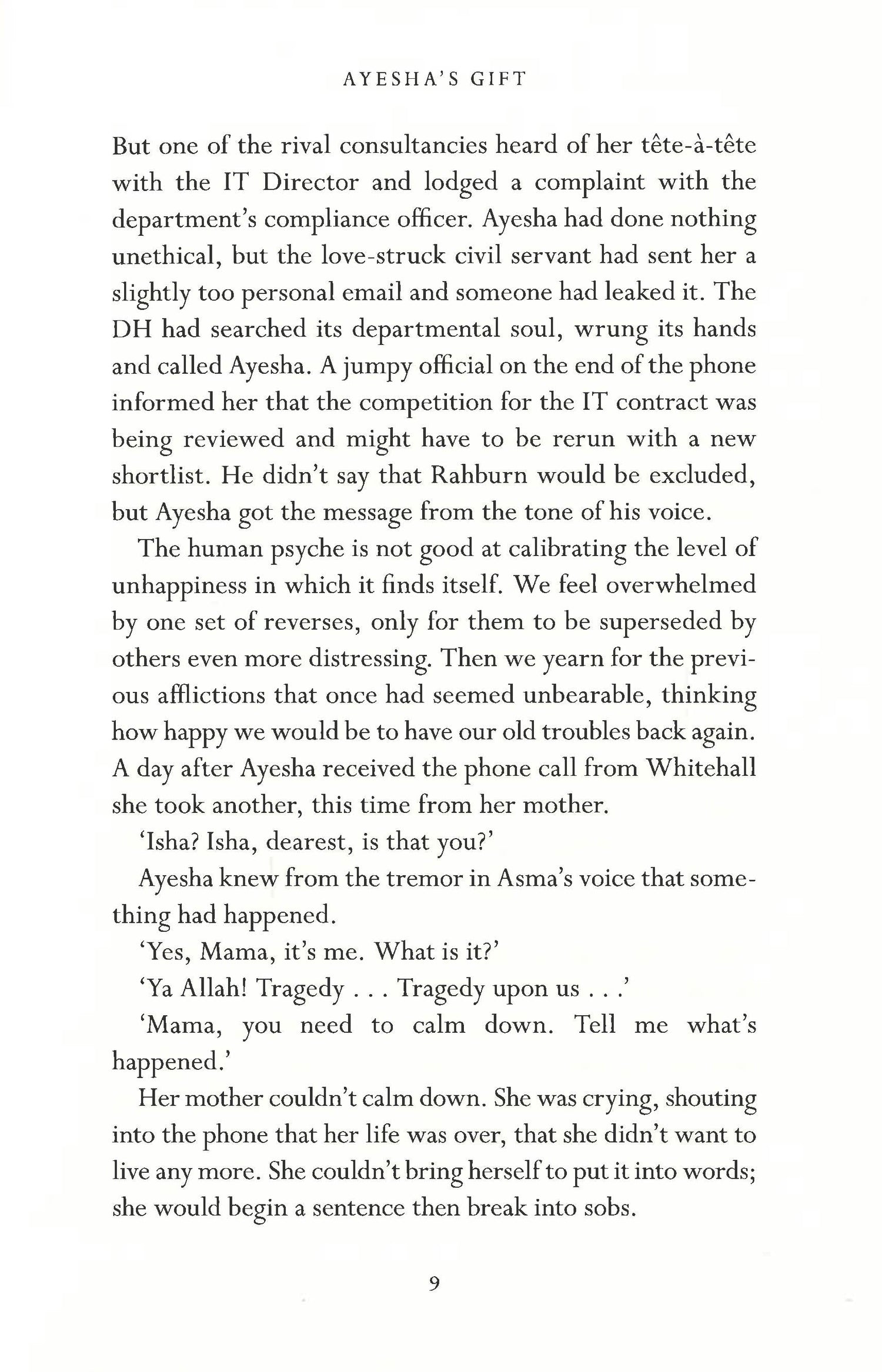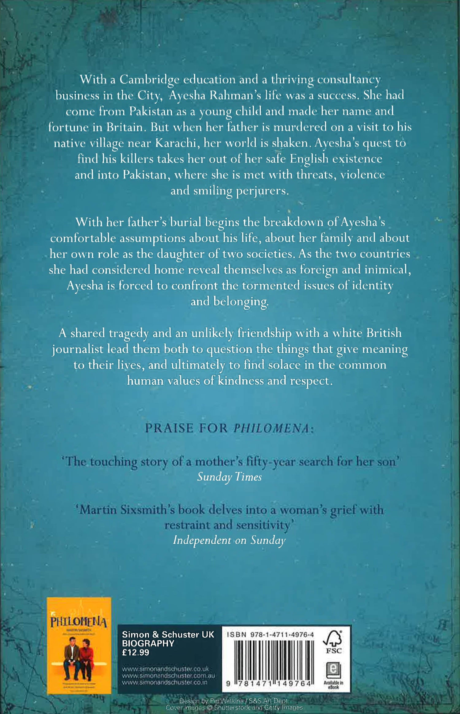 As the two countries she had considered home reveal themselves as foreign and inimical, Ayesha is forced to confront the tormented issues of identity and belonging. When she travels to Pakistan, Martin Sixsmith goes with her. A shared tragedy and an unlikely friendship lead them both to question the things that give meaning to their lives, and ultimately to find solace in the common human values of kindess and respect.