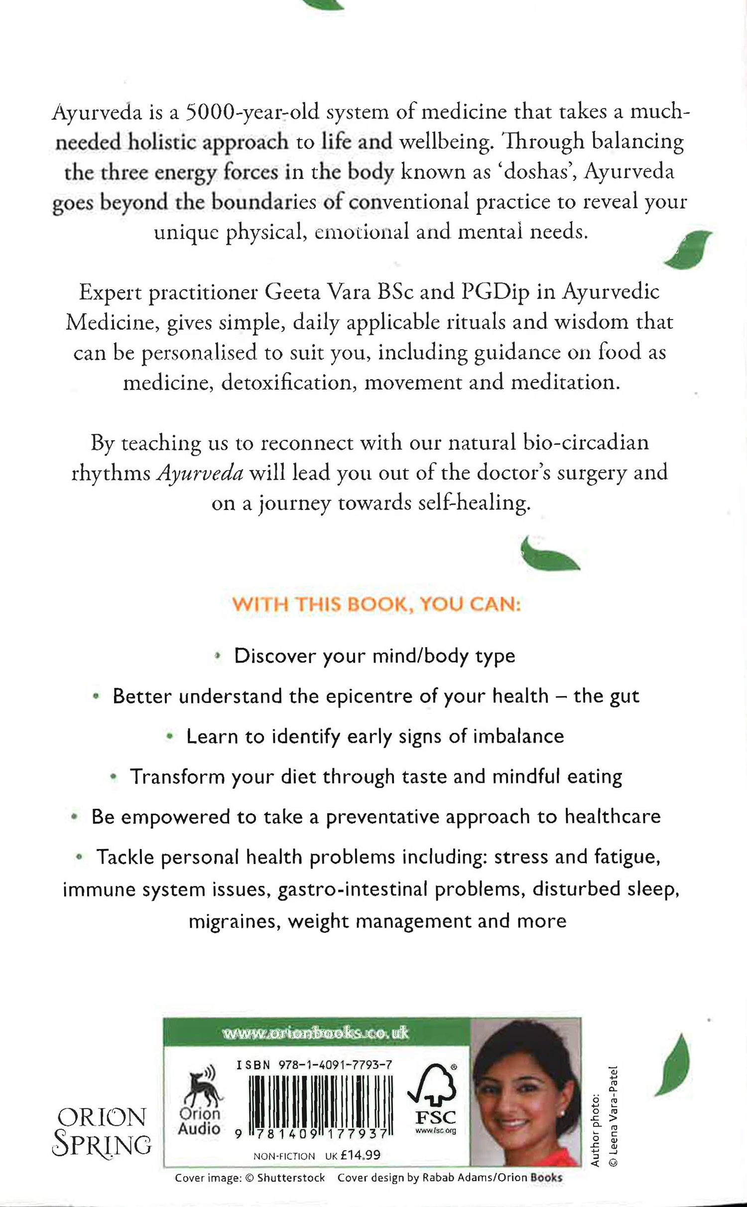 An excellent masterpiece that brings the ancient timeless wisdom of Ayurveda, in a very simple and practical way, to our modern day-to-day life' - Dr Vasant Lad, Director of The Ayurvedic Institute Ayurveda is a 5000-year-old system of medicine that takes a much needed holistic approach to life and wellbeing. Through balancing the three energy forces in the body known as 'doshas', Ayurveda goes beyond the boundaries of conventional practice to reveal your unique physical, emotional and mental needs. Expert practitioner Geeta Vara BSc and PGDip in Ayurvedic Medicine, gives simple, daily applicable rituals and wisdom that can be personalised to suit you, including guidance on food as medicine, detoxification, movement and meditation. By teaching us to reconnect with our natural bio-circadian rhythms, Ayurveda will lead you out of the doctor's surgery and on a journey towards self-healing. WITH THIS BOOK, YOU CAN: * Discover your mind/body type * Better understand the epicentre of your health - the gut * Learn to identify early signs of imbalance * Transform your diet through taste and mindful eating * Be empowered to take a preventative approach to healthcare * Tackle personal health problems including: stress and fatigue, immune system issues, gastro-intestinal problems, disturbed sleep, migraines, weight management and more