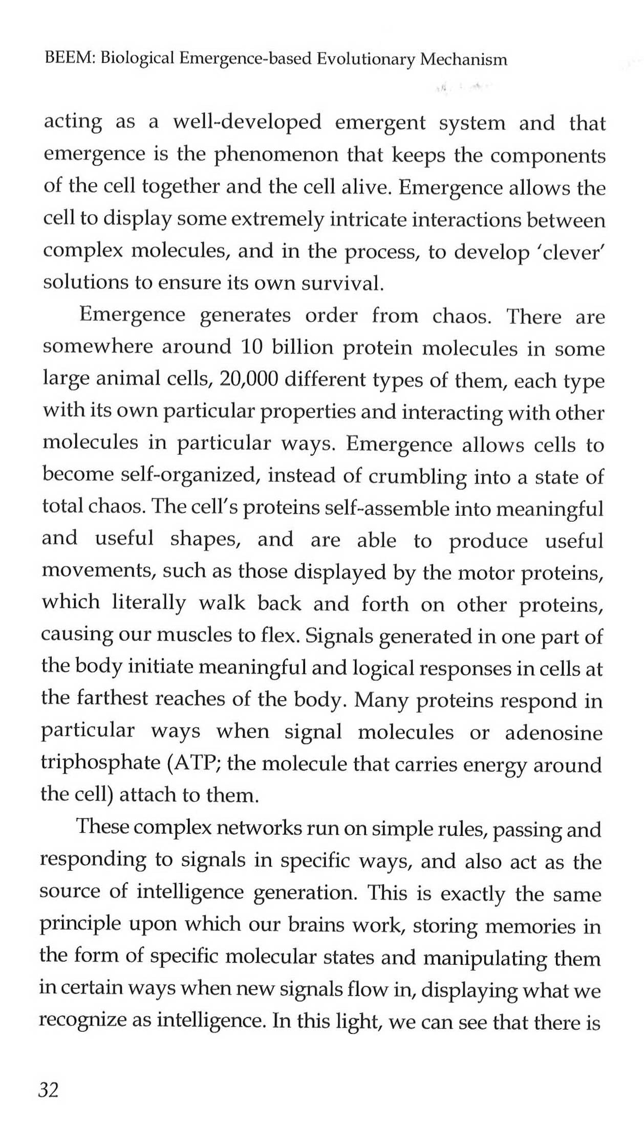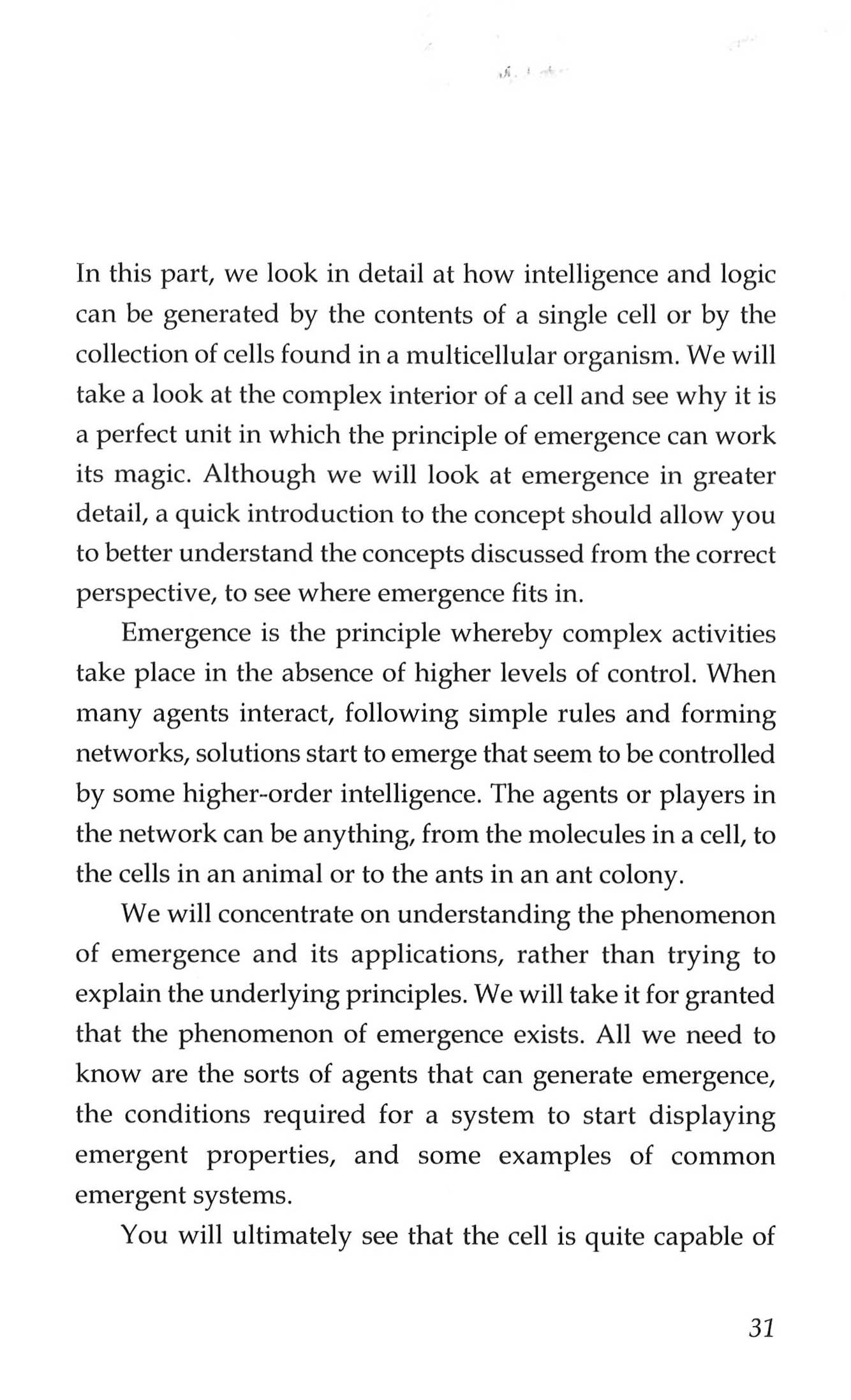 The principles of emergence, swarm intelligence and signal networks, which he proposes are available to all living organisms, could in fact be the real forces that cleverly and logically drive the evolution of every species on earth. Our brains work by exploiting these very same principles. It is proposed that the complex signal networks that exist between the millions of protein molecules in a cell, or the billions of cells that make up larger organisms, are also capable of generating intelligent solutions, albeit at a slower pace.