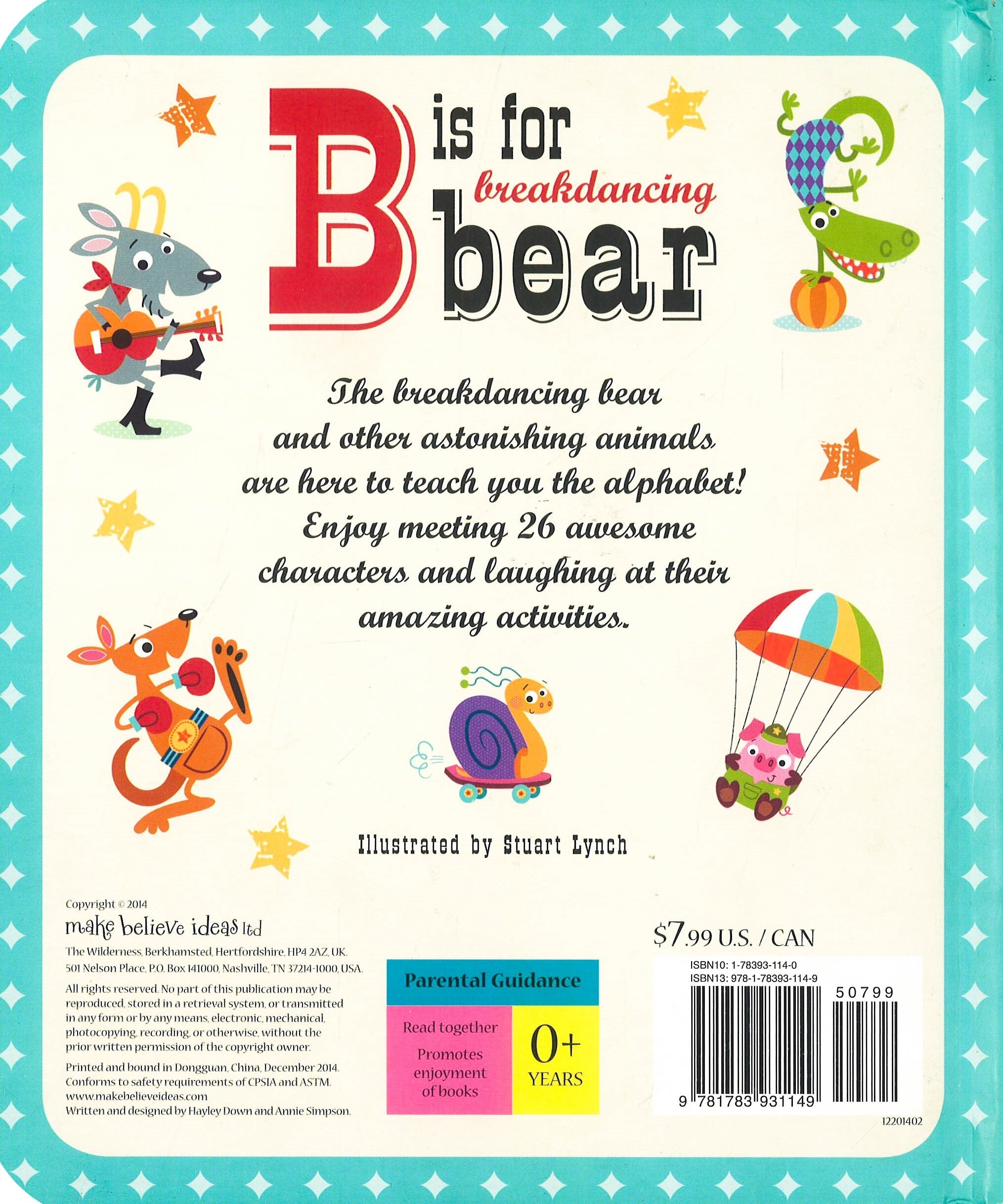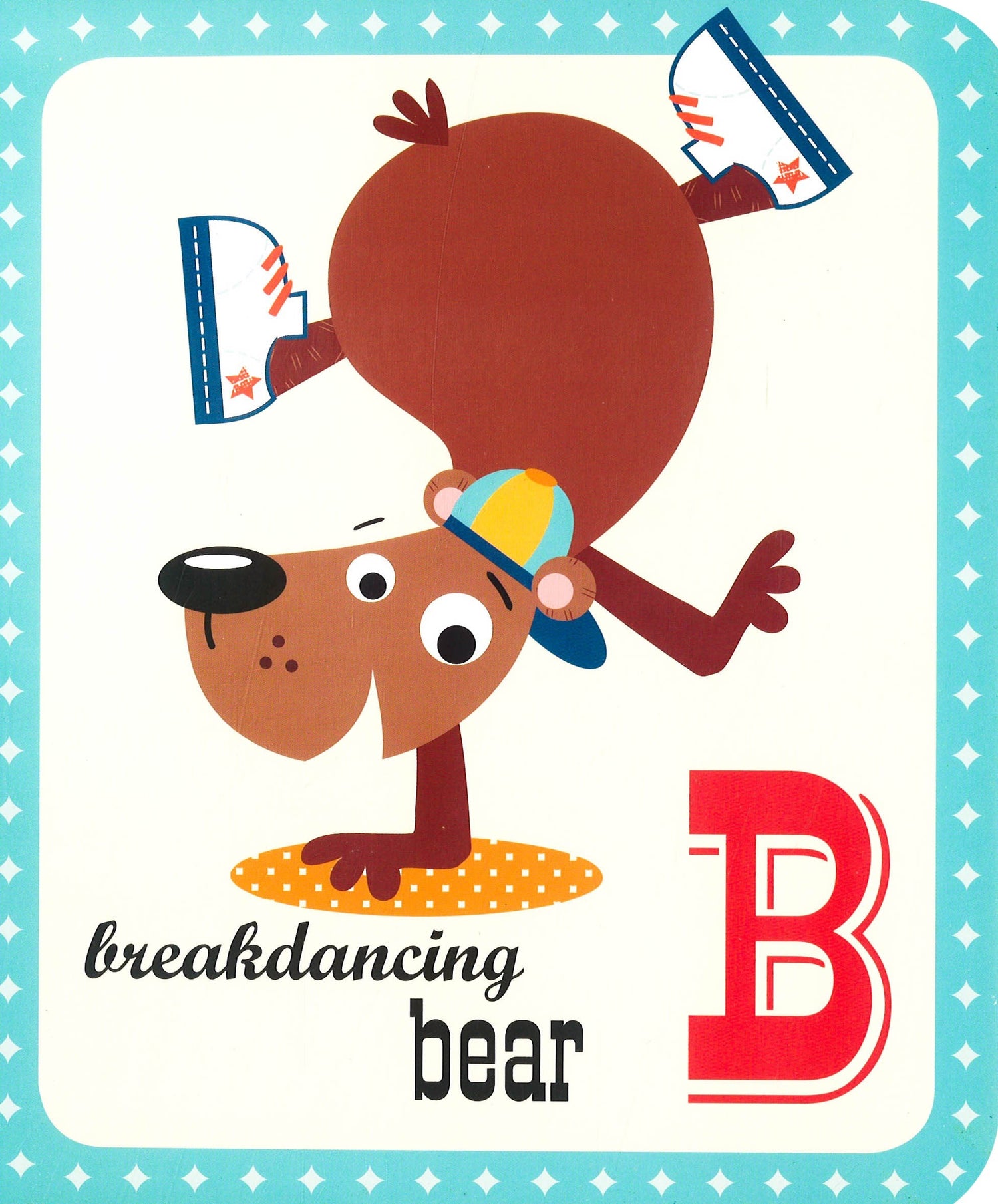 Amazing animals help children learn the alphabet, with fun illustrations and funny word labels.B is for Breakdancing Bearis a stunning board book, bursting with hilarious illustrations of animals that children and adults will adore!Each amazing animal is doing a fun activity that children will love to look at. The simple word labels help children learn the alphabet in a fun way.
