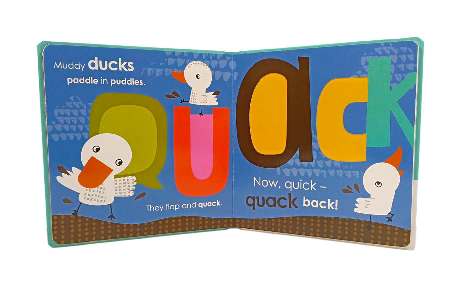 Learn fun farmyard sounds with the noisy animals in this book! Read the playful rhyming text, and then touch and feel the letters on each page.