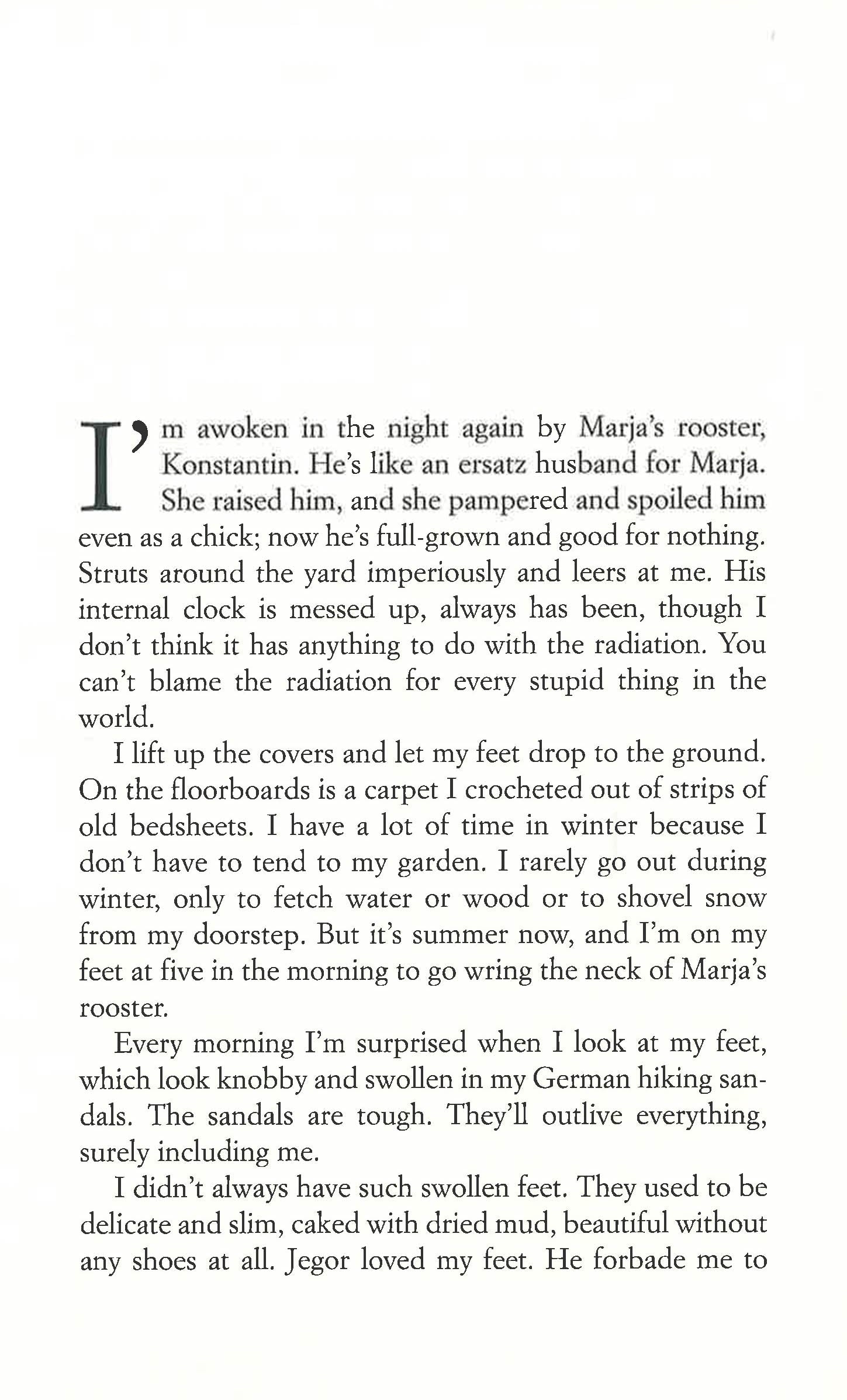 Government warnings about radiation levels in her hometown (a stone's throw from Chernobyl) be damned! Baba Dunja is going home. And she's taking a motley bunch of her former neighbors with her. With strangely misshapen forest fruits to spare and the town largely to themselves, they have pretty much everything they need and they plan to start anew. The terminally ill Petrov passes the time reading love poems in his hammock; Marja takes up with the almost 100-year-old Sidorow; Baba Dunja whiles away her days writing letters to her daughter. Life is beautiful. That is until one day a stranger turns up in the village and once again the little idyllic settlement faces annihilation. From the prodigiously talented Alina Bronsky, this is a return to the iron-willed and infuriatingly misguided older female protagonist that she made famous with her unforgettable Russian matriarch, Rosa Achmetowna, in The Hottest Dishes of the Tartar Cuisine. Here she tells the story of a post-meltdown settlement, and of an unusual woman, Baba Dunja, who, late in life, finds her version of paradise.