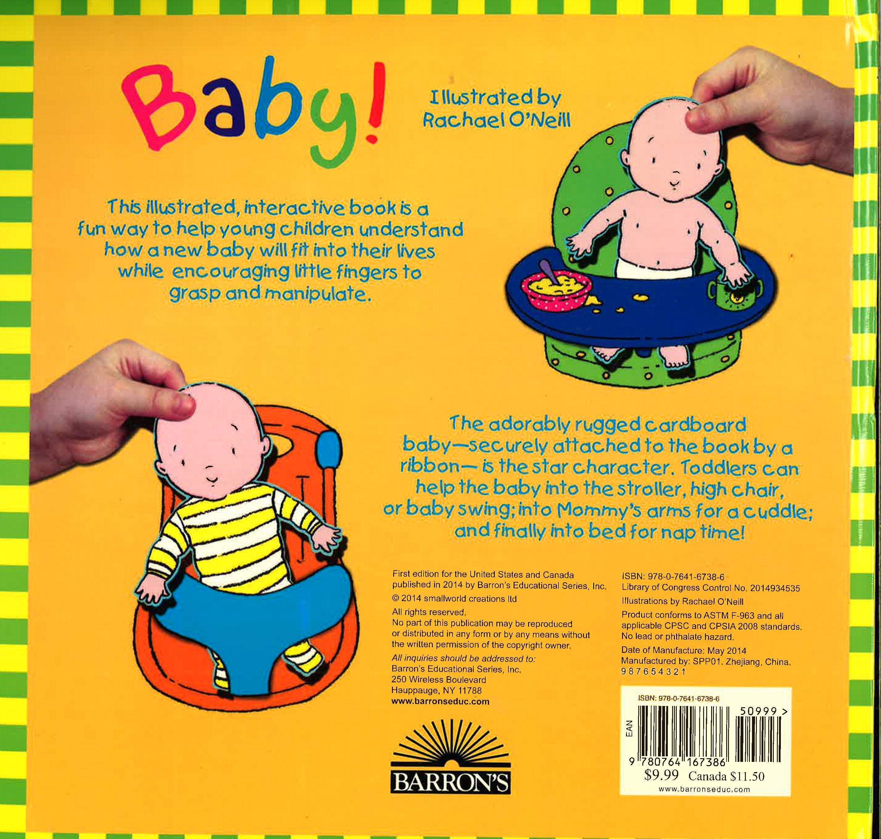 This interactive book was created especially for young children awaiting the arrival of a new baby. An adorably rugged cardboard baby, securely attached to the book by a ribbon, is the star character. Each page contains an illustration with a special opening just for baby. Toddlers can help the baby into the stroller, highchair, or baby swing; into Mommy s arms for a cuddle; and finally into bed for naptime. An engaging way to help toddlers understand how a new baby will fit into their lives, while encouraging little fingers to grasp and manipulate.