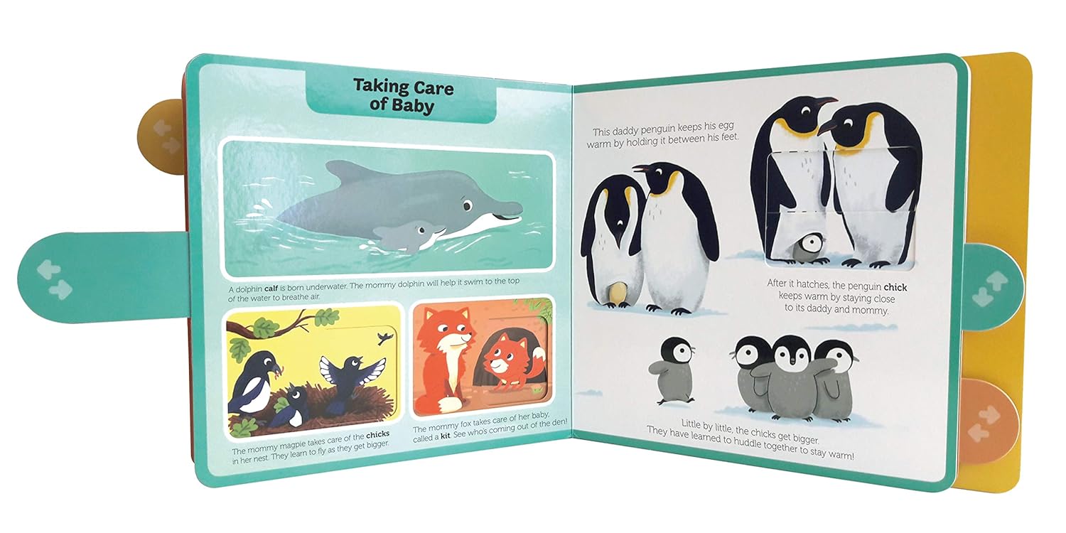 PlayTabs: Baby Animals has big tabs to push and pull for hands-on learning fun!Chicks, kittens, puppies, and lots of other baby animals are featured in this interactive book that encourages young children to push and pull while engaging in active learning. Pull a tab to see baby birds learn to fly or push a tab to see how a baby penguin keeps warm.