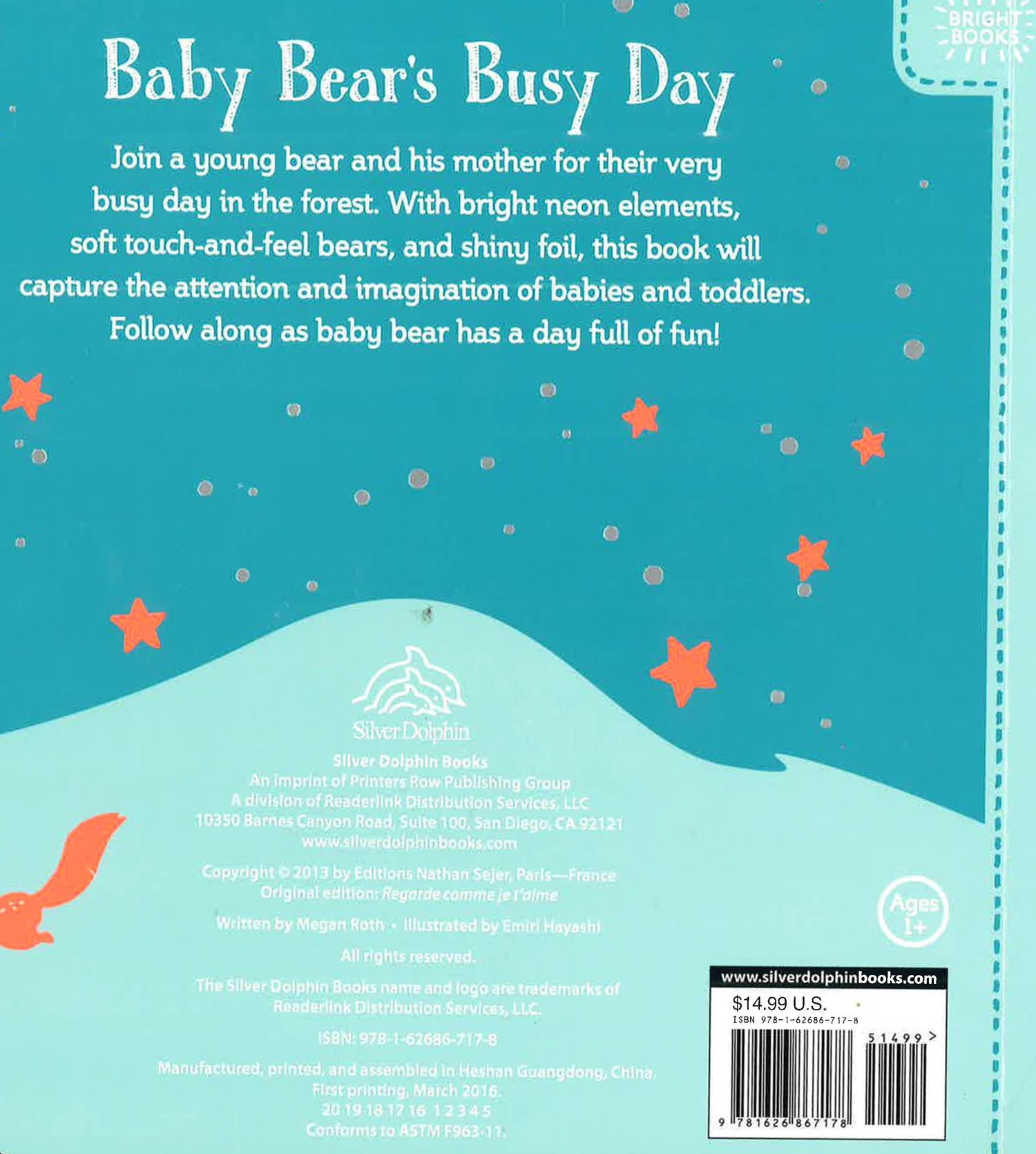 It's a busy day for baby bear. Come along as he and his mother explore the wonders of the forest! Join a young bear and his mother for their very busy day in the forest with Bright Books: Baby Bear's Busy Day. This visually stunning board book features bright neon elements, soft touch-and-feel bears, and shiny foil that will capture baby's full attention and imagination. With sweet, soothing text and gentle illustrations, this engaging book will become a bedtime favorite. Follow along as baby bear has a day full of fun!