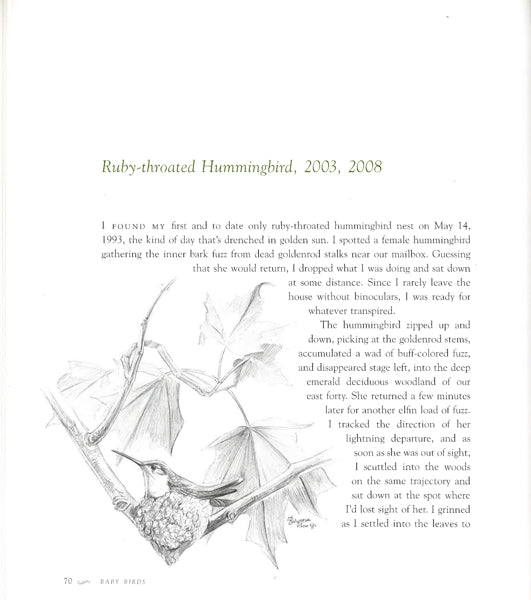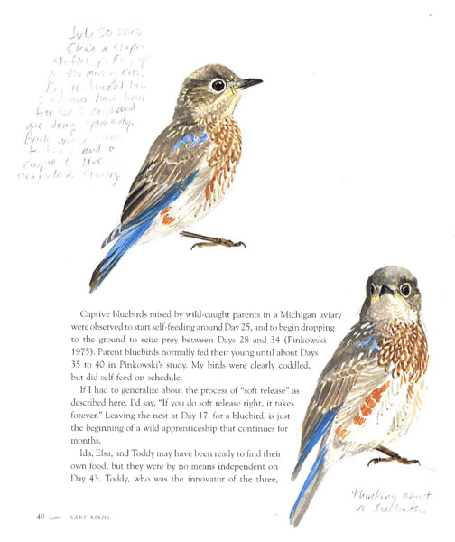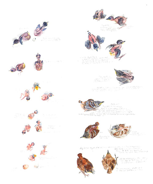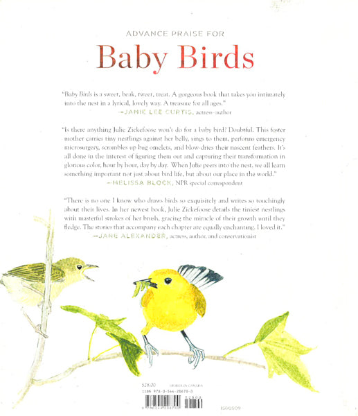 This beautiful book is as much an art book as it is a natural history, something readers have come to expect from Julie Zickefoose. More than 400 watercolor paintings show the breathtakingly swift development of seventeen different species of wild birds. Sixteen of those species nest on Julie's wildlife sanctuary, so she knows the birds intimately, and writes about them with authority. To create the bulk of this extraordinary work, Julie would borrow a wild nestling, draw it, then return it to its nest every day until it fledged. Some were orphans she raised by hand, giving the ultimate insider’s glimpse into their lives. In sparkling prose, Julie shares a lifetime of insight about bird breeding biology, growth, and cognition.