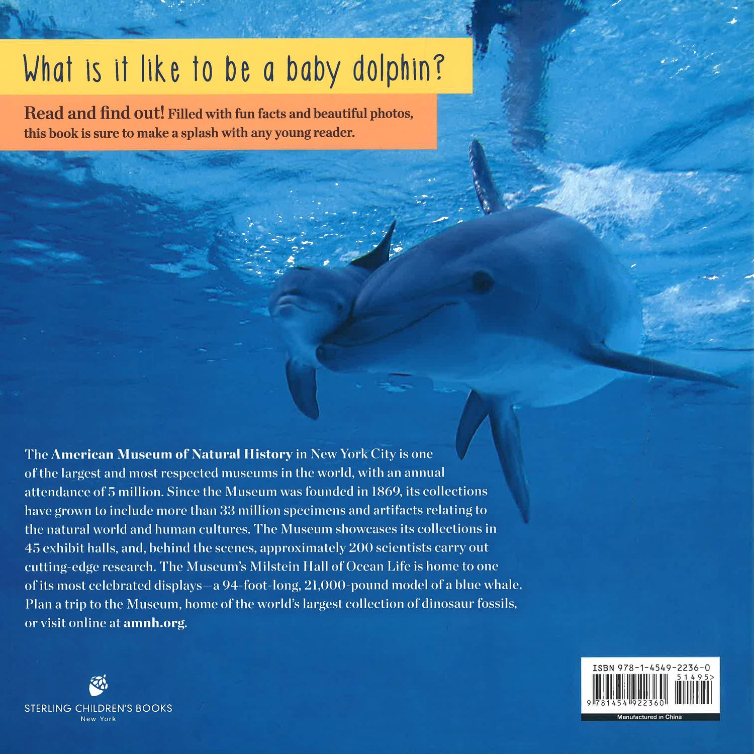 Meet a baby dolphin and see how he spends his first day in the ocean! Developed in conjunction with the American Museum of Natural History, this nonfiction picture book follows a dolphin from birth as he swims with his mom; learns to eat, jump, and play with his pod; and even escapes a shark. With its beautiful ocean photography and fun dolphin facts, this sweet story will make a splash with any young reader.
